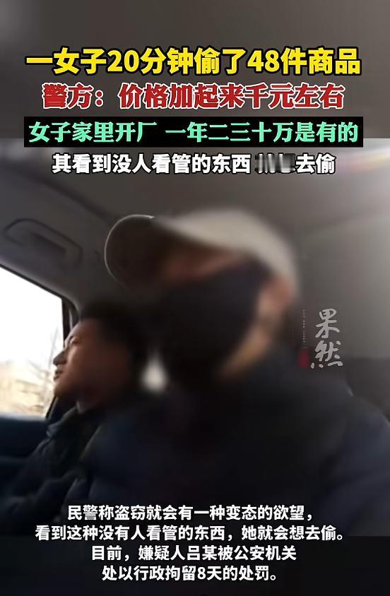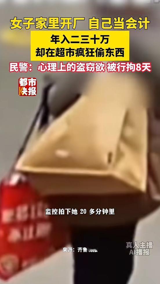 “万万没想到!”近日,浙江绍兴,一女子逛超市时,把自己遮的严严实实,趁周围没人,就把喜欢的商品藏到自己包里面,短短20分钟内,就盗了48件商品,没想到的是,女子年薪几十万,偷东西纯属“过瘾”!网友:理解不了! 浙江绍兴有一名女子吕某,家境十分优越,家里开着一家小工厂,她自己则在厂里担任会计,收入稳定且丰厚。 按说以她的条件,买任何日用品都不用眨眼睛,可她偏偏有个让人无法理解的怪癖,成了她摆脱不掉的枷锁。 吕某的怪癖就是,只要看到没人看管的东西,心里就会莫名发痒,那种想把东西占为己有的欲望,根本压不住。 之前她就有过盗窃的经历,只是没被太多人知道,也没受到太严重的惩罚,这也让她的欲望越来越强烈。 前段时间的一天下午,吕某又没控制住自己,特意做了一番伪装,戴上帽子和口罩,把整张脸遮得严严实实,还特意背了个能装很多东西的大包,直奔越城区的一家超市。 进了超市后,她脚步轻快地在货架之间穿梭,眼神一刻不停地观察着周围的动静,生怕被人发现。 一旦发现身边没人,她就立刻停下脚步,飞快地从货架上拿起小东西往包里塞,动作娴熟得让人心惊,看得出来,她已经做过很多次这样的事。 从货架上的化妆品、洗漱用品,到角落里的宠物零食,只要是体积小、容易藏匿的,她都一一收入囊中,短短二十多分钟,大包就被塞得满满当当,沉甸甸的。 装完之后,她低着头,趁着超市里人少,悄悄溜了出去,没被任何人发现。 吕某以为自己做得天衣无缝,却没想到,第二天一早就露了馅。 超市店员像往常一样进行库存盘点,发现好几处货架都出现了空缺,原本整齐摆放的商品不翼而飞,查了前一天的销售流水才发现,这些空缺的商品,根本没有卖出记录。 意识到商品被偷后,店员赶紧调出超市的监控录像,很快就锁定了吕某的身影,看着她熟练偷东西的模样,店员当即就报了警。 警方根据监控里的行动轨迹,没花多长时间就找到了吕某。见 到吕某的那一刻,不管是民警还是店员,都十分意外,她穿着得体,谈吐优雅,怎么看都不像是会偷东西的人。 面对民警的调查,吕某没有丝毫辩解,坦然承认了自己偷东西的事实,也说出了自己的苦衷。 她坦言,自己偷东西从来不是为了省钱,毕竟这些小东西加起来也就一千块左右,对她来说根本不值一提。 她只是控制不住自己的欲望,那种看到没人看管的东西就想拿走的冲动,让她痛苦又无力。 每次偷完东西,她都会陷入深深的自责和空虚,可下一次遇到同样的情况,还是会忍不住伸手,就像染上了瘾一样,无法自拔。 很多人得知这件事后,都觉得吕某是闲得没事找事,明明年薪几十万,却偏偏要做这种违法又掉价的事,实在让人无法理解。 但吕某的这种行为并不是单纯的“作”,而是一种心理疾病,在医学上被称为“盗窃癖”,属于冲动控制障碍的一种。 这种心理疾病大多发生在经济条件较好的人身上,他们偷东西,图的不是商品的价值,而是偷窃过程中那种紧张的刺激感,以及得手后的短暂释放,用来填补心理上的空缺。 当然,心理有疾病,不能成为违法的借口,偷东西终究要受到法律的制裁。 最终,公安机关对吕某处以行政拘留八天的处罚,她偷的所有商品都被归还超市,相关的赔偿和罚款也全部缴清。 只是,拘留只能起到惩戒作用,想要真正帮吕某摆脱这种困境,还需要专业的心理干预和治疗。 这种心理成瘾,单靠个人意志力很难改掉,必须有专业医生介入,帮她找到问题的根源,慢慢疏导矫正。 不然,这次是八天拘留,下次可能就会因为无法控制自己,做出更严重的事情,到时候付出的代价,就不是拘留这么简单了。