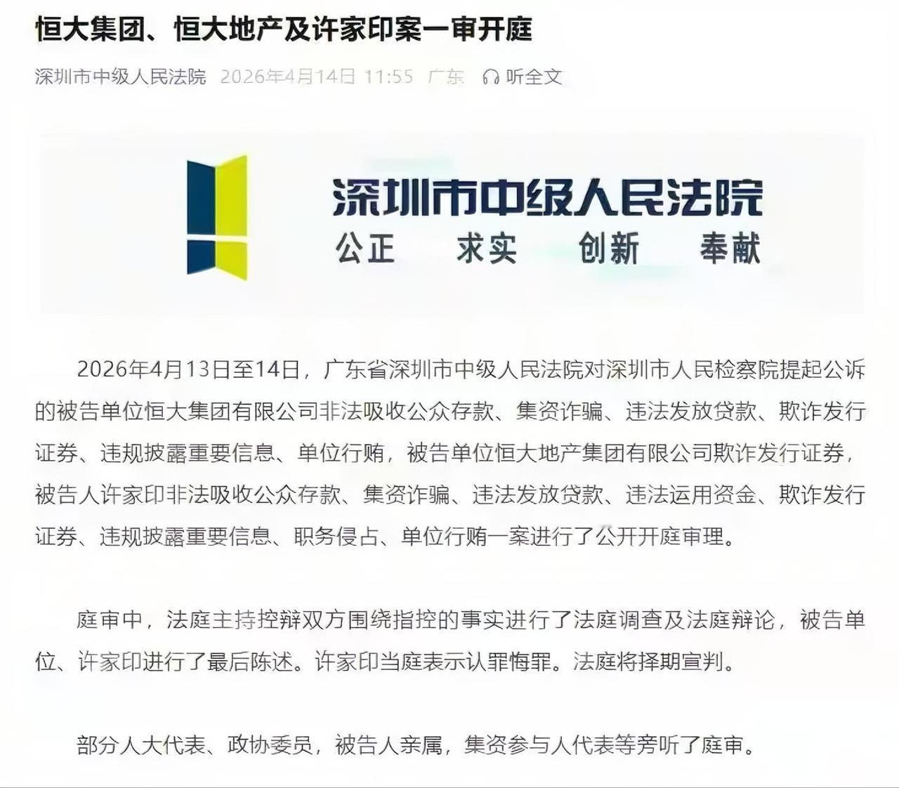恒大集团、恒大地产及许家印案一审开庭 2026年4月13日至14日,广东省深圳市中级人民法院对深圳市人民检察院提起公诉的被告单位恒大集团有限公司非法吸收公众存款、集资诈骗、违法发放贷款、欺诈发行证券、违规披露重要信息、单位行贿,被告单位恒大地产集团有限公司欺诈发行证券,被告人许家印非法吸收公众存款、集资诈骗、违法发放贷款、违法运用资金、欺诈发行证券、违规披露重要信息、职务侵占、单位行贿一案进行了公开开庭审理。 这场庭审等了太久。从2021年恒大债务暴雷到现在,无数普通人的血汗钱被套在里面。有人买了恒大的理财,有人交了房子的首付,还有人把养老钱投了进去。 法庭上那些罪名,听着就让人喘不过气。非法吸收公众存款、集资诈骗、违法发放贷款……一个个罪名背后,是多少家庭的希望破灭。许老板当年在台前风光无限,拿着几千万年薪,住着豪宅坐着私人飞机,谁想到背后是这样一幅景象? 数据摆在眼前。恒大集团总负债一度超过2.4万亿元,其中涉及个人投资者的理财产品规模就高达400多亿元。这些钱去哪了?有的被拿去盲目扩张,有的被用来还旧债,还有的通过各种隐秘渠道流向了哪里,只有他们自己清楚。 最扎心的是那些普通购房者。房子停工了,贷款还得接着还。银行不管你房子能不能交,每个月的月供一分不能少。有人问凭什么?凭的就是合同上你签的字。可问题是,如果开发商从一开始就在欺诈发行证券、违规披露信息,这合同还站得住脚吗? 许家印身上的罪名,从非法吸存到职务侵占,从单位行贿到违法运用资金,整整八项。这不是简单的经营失败,这是有组织、有预谋的违法违规行为。一个企业家如果连基本的法律底线都守不住,那赚再多的钱也是建立在别人的痛苦之上。 有人说这是房地产行业野蛮生长的必然结局。我不完全同意。行业有风险,经营有起伏,这都能理解。但拿着别人的钱去填自己的坑,用虚假信息欺骗投资者,这就不是行业周期的问题了,是违法犯罪的问题。 庭审虽然结束,但真正的考验才刚刚开始。受害者的钱能不能追回来?烂尾楼能不能复工?那些被牵连的家庭该怎么办?这些问题比判刑更难解决。法律给出了对错的判断,却未必能给出完整的救赎。 这一天的庭审,是对过去疯狂年代的清算。它告诉所有企业经营者:别以为自己能大到不能倒,别以为关系够硬就能为所欲为。法律这把刀,落下的时候从不看你的身价。 各位读者你们怎么看?欢迎在评论区讨论。
