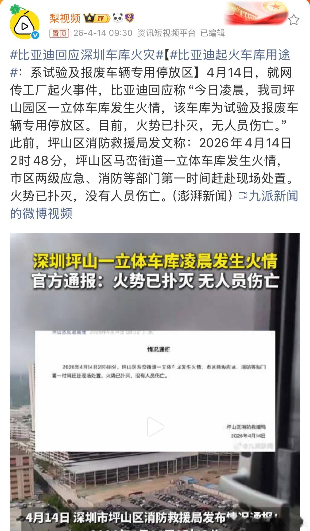 比亚迪回应深圳车库火灾看了一下目前的消息,火已经扑灭了,是比亚迪试验和报废车辆专用停车场,不是量产车生产区域,也没有新车在那边,没有人员伤亡。
