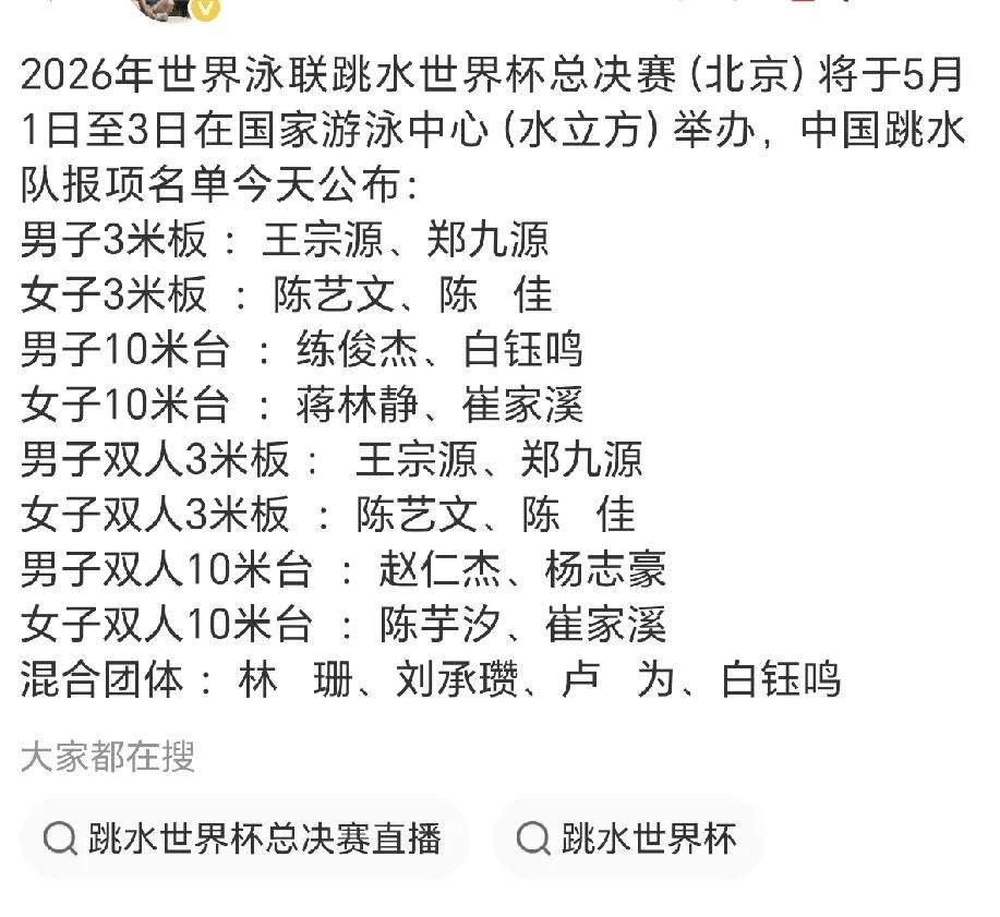 2026年世界泳联跳水杯北京总决赛,5月1日一3日在北京水立方举行,正是五一假期肯定有很多水迷观赛,奥运会双子星全红婵,陈芋汐,全红婵不参赛,陈芋汐只有一项双人搭档年轻队员崔家溪。 十米台单人是年轻队员,将林静,崔家溪。这就是时代的变化吧,喜欢看全红婵,陈芋汐,一起跳单人,双人的水迷们多少有些失落,但是其他队员也跳的很好,继续支持中国跳水队,祝福跳水队越来越好。