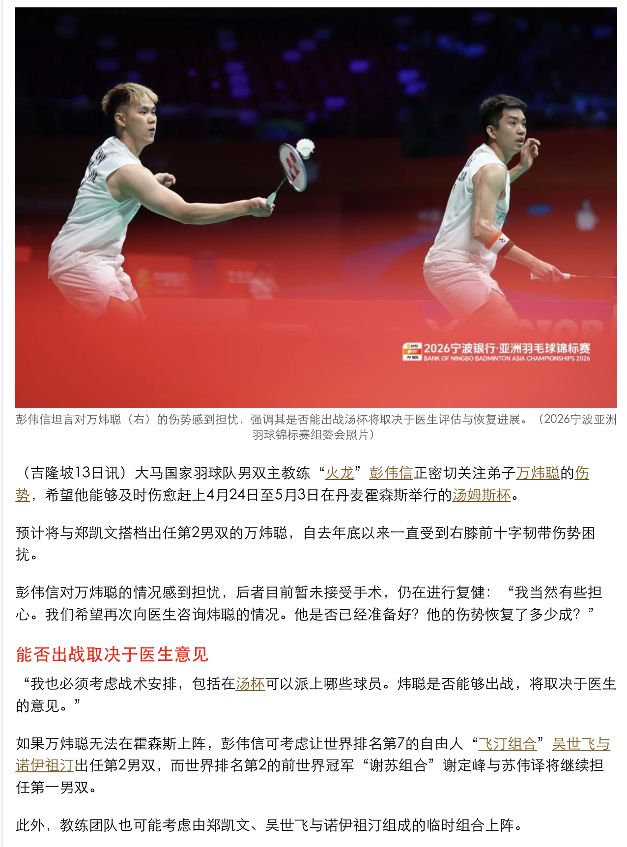 根据赛会规定,若万炜聪无法出战,大马队不能增补新组合,只能以其他球员替换他,彭伟信可考虑让世界排名第7的自由人“飞丁组合”出任第2男双,而世排第2的前世界冠军“谢苏组合”将继续担任第一男双。