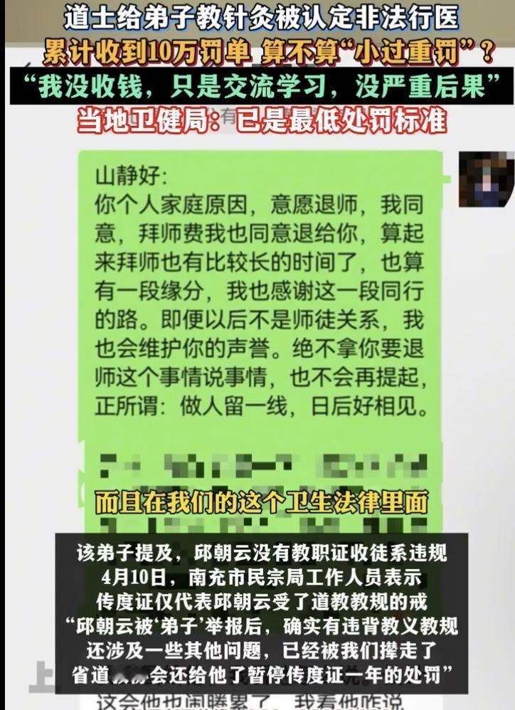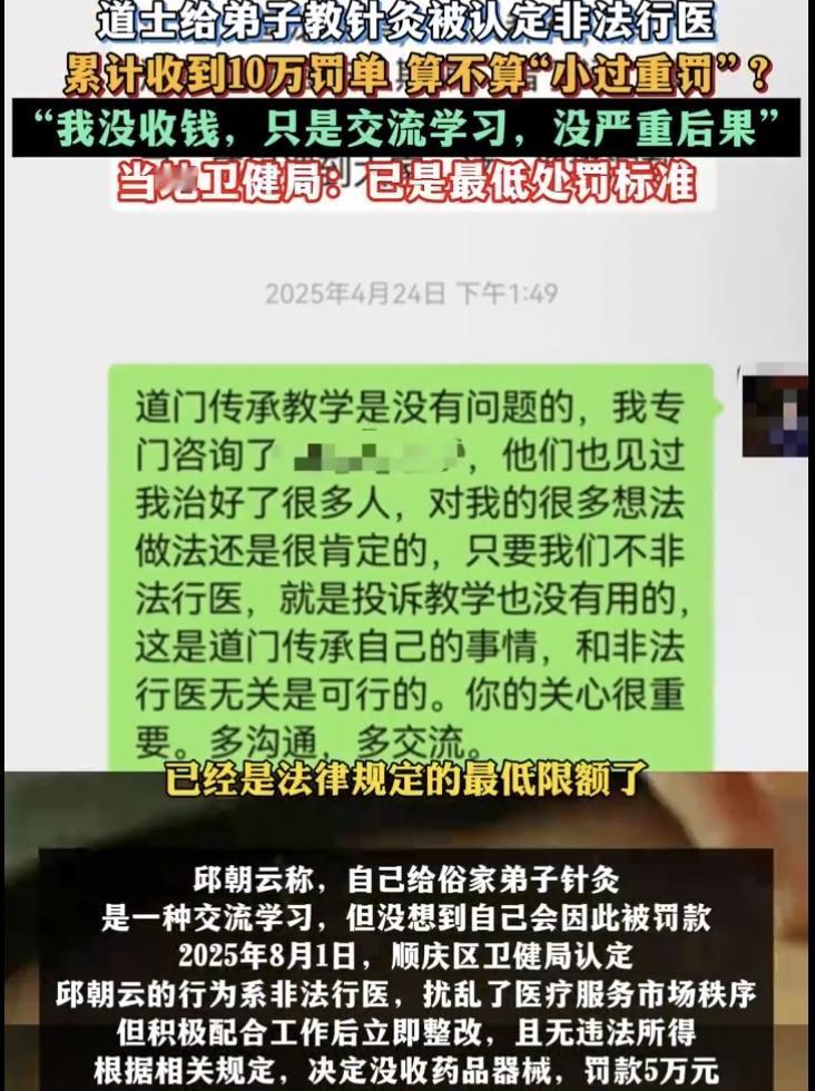 道士教弟子针灸被罚10万!无收费却按违法所得罚!四川南充道士邱朝云,因给俗家弟子教授针灸、彼此互相施针练习,被当地卫健部门认定为非法行医,先是被罚5万元,又因逾期未缴纳罚款被加罚5万,累计处罚金额高达10万元。此事一经曝光,瞬间引发全网热议,明明没有收费、无任何违法所得,却被定性为非法行医,这样的处罚结果和执法逻辑,实在让人难以理解。 当地卫健部门给出的处罚依据,更是让人大跌眼镜:邱朝云虽没有违法所得,但“没有违法所得”被认定属于“违法所得不满1万元”,也要按照1万元的标准来罚款,还声称按1万元的标准已经是从轻处罚,并非小过重罚。这句话实在经不起推敲,没有收费和违法所得不满1万元,明明是完全不同的两个概念,正常人都能分清其中的区别,无所得怎么能等同于所得不足一万呢?这种自相矛盾的逻辑,简直是在颠覆大众的认知,按这个道理来讲,没有收入就等于收入不满一万元,没有偷窃就等于偷窃所得不足一万,岂不是天下奇谈? 不少网友对此提出质疑,单纯的教学针灸、弟子之间互相施针切磋,怎么就变成了非法行医?如果说有实际的治病收费行为,要求从业者考取医师资格证无可厚非,可考证之前的学习练习、技艺传承,难道也要被定性为非法行医吗?想要行医必须考证,可学习练习的过程又被认定非法,这无疑陷入了一种死循环,实在让人无奈。大家纷纷呼吁,希望相关部门能正视这个问题,制止这种不合理的乱罚款行为,也希望国家能出台更合理的规定,规范这类传统技艺的传承。 要知道,道教本身就有着医学教授与传承的传统,自古便有道医,道医不仅懂武术,还精通诊脉、开药、针灸、推拿、骨伤诊疗等技艺,这是传承千年的文化瑰宝,是中华文明的重要组成部分。中医和西医本就是不同的知识体系和操作模式,两者都该依据实际情况为人所用,而不是让中医被不合理的规定压制,更不能一味用处罚来扼杀传统中医技艺的传承。针灸是我国中医的瑰宝,理应得到保护和传承,相关部门更应该做的是正确规范管理、合理引导,而不是不分情况一概处罚。 如今很多民间中医、传统技艺传承人,都是靠着师承、祖传的方式学习医术,积累了大量的实践经验,武学界的世家大多也会医治跌打损伤,如果不问缘由,只要没有相关证件就按非法行医处罚,民间中医和传统技艺迟早会走向消亡。更让人细思极恐的是,按照这样的判定逻辑,以后在路上遇到需要紧急救援、紧急包扎的人,没有医师资格证的普通人还敢伸手帮忙吗?难道善意的急救也要被认定为非法行医?这和老人跌倒该不该扶的困境,简直异曲同工,若是寒了大众的心,断了传统技艺的传承,实在得不偿失。 还有网友指出,此次事件中,举报师父的俗家弟子也引发争议,明知对方没有相关行医资质,依然拜师学习针灸技艺,后续却以此为由举报,实在让人唏嘘。而卫健部门在处罚时,也该厘清教学切磋和实际诊疗行医的边界,道观内的师徒技艺传承,并非对外挂牌行医,不该直接套用非法行医的处罚条款。同时,对于“弟子施针后一度休克”的说法,也该明确施针与休克之间是否存在真正的因果关系,拿出切实的证据,而不是模糊定性、草率处罚。 传统中医传承不易,道医文化更是中华瑰宝,不能让生硬的条款、不合理的执法,阻断了千年技艺的延续。执法理应兼顾法理与情理,分清是非边界,既要规范医疗行业,也要守护好传统中医的传承根基,别让传承者寒心,别让瑰宝就此埋没。