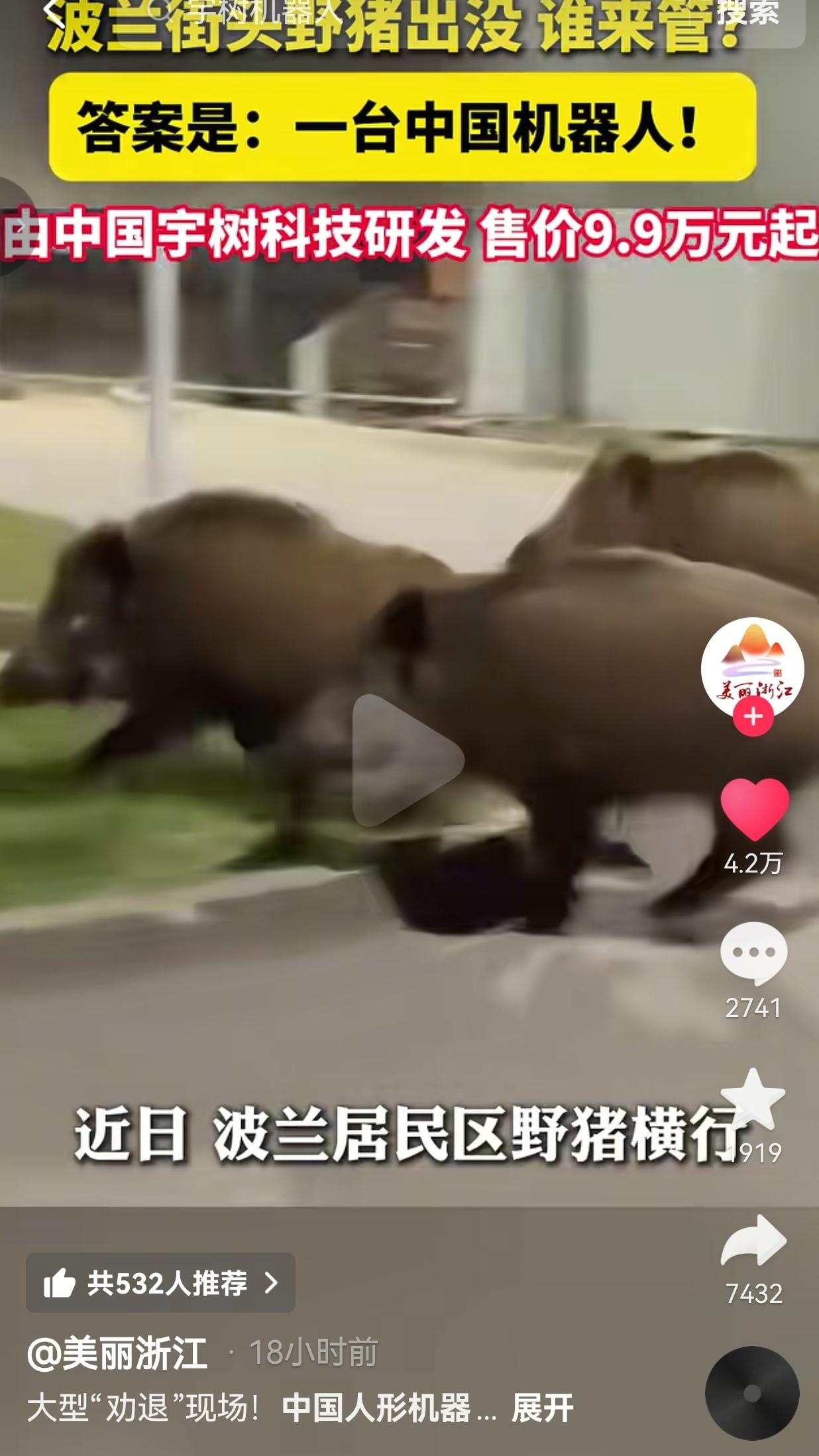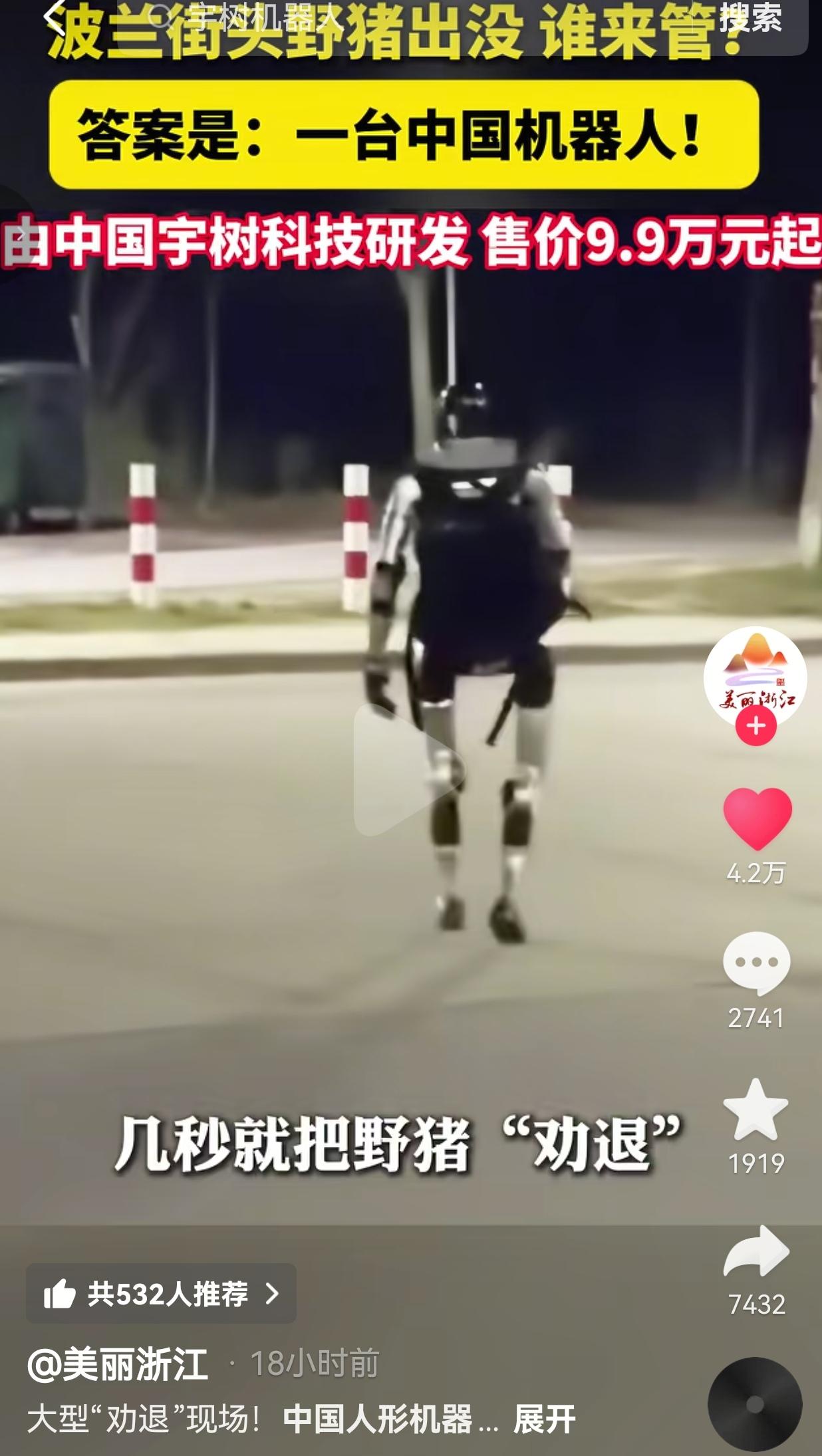这简直是现实版的“未来科技降维打击”!波兰街头突然冒出一群野猪横冲直撞,当地人愁坏了,结果派出来的“治安人员”居然是一台中国造的人形机器人! 面对体型两倍于自己的野猪,这机器人几秒就把它“劝退”,完事还潇洒挥手拜拜?这波中国科技的排面,直接拉满! 近日,波兰当地居民区野猪频繁出没,甚至直接在街头横行,不仅影响交通,还把居民吓得不敢出门,传统的驱赶方式完全没用,当地人简直愁坏了。 结果人家直接搬出了大杀器——一台由中国宇树科技研发的G1型人形机器人!这机器人一出场,那气场直接拉满,黑白配色的外形,蓝光亮起的头部,走在深夜的波兰街头,就像从未来穿越过来的“保安”,让人觉得安全感爆棚! 画面里看得特别清楚:一群野猪在草地上乱窜,面对体型两倍于自己的“庞然大物”,野猪还想往前凑,结果这台中国机器人淡定上前,几步一逼,几秒就把野猪彻底“劝退”,赶得乖乖撤退! 赶跑之后,机器人还挥起手臂跟野猪挥手拜拜,那画面又酷又逗,网友直呼:这画面太有科幻感了! 这台机器人售价9.9万元起,虽然不算便宜,但对比能避免的安全隐患、还有找人驱赶的高额成本,简直是性价比之王!不得不说,这才是真正的“中国智造”硬实力! 网友看到后评论说:我去!这也太帅了吧!波兰街头居然出现中国机器人赶野猪,这画面跟科幻大片一样! 也有的网友说:老外彻底服了!以前都是羡慕国外科技,现在轮到我们输出硬核技术了!这机器人赶野猪,简直是降维打击! 还有的网友说:太有安全感了!野猪这种猛兽,换个人都不敢轻易上前,机器人居然这么淡定,中国科技真的太靠谱了! 更有网友表示:这就是中国实力!从日常到海外,中国机器人都在发光发热,必须为国产点赞! 说实话,看完这个视频我直接热血沸腾! 以前我们总觉得,国外的机器人技术多厉害多先进,可这次波兰街头的一幕,直接打破了这种刻板印象!一台中国宇树的G1人形机器人,简单几步就搞定了让当地人头疼的野猪难题,不仅展现了机器人超强的稳定性、灵活性,更让全世界看到了中国科技的硬核实力! 更让人佩服的是,这机器人不是冷冰冰的机器,它有温度、有行动,甚至还有点可爱的“挥手拜拜”,把原本危险的场景变成了一场科技秀! 9.9万起的售价,也让更多人能接触到顶尖的人形机器人技术,不再是遥不可及的未来产物。 这不是简单的“赶野猪”,这是中国智造在世界舞台上的一次精彩亮相!是我们用技术解决实际问题,用实力赢得认可,让“中国创造”四个字在海外闪闪发光! 从日常的生活服务,到海外的难题解决,中国科技从来没让人失望过。 这台G1人形机器人,不仅能赶野猪,还能在更多场景发挥作用,守护安全、便利生活。 它告诉我们:中国的创新力、硬实力,已经走到了世界前列!别再觉得国外的月亮比较圆,我们身边的科技,早就牛到飞起! 愿更多中国科技走出国门,用硬核实力征服世界,让“中国智造”成为全球的骄傲! 最后,我想说的是:中国智造硬核输出,人形机器人惊艳世界!别让偏见遮住眼,中国科技,早已站在世界之巅。 信息来源:美丽浙江