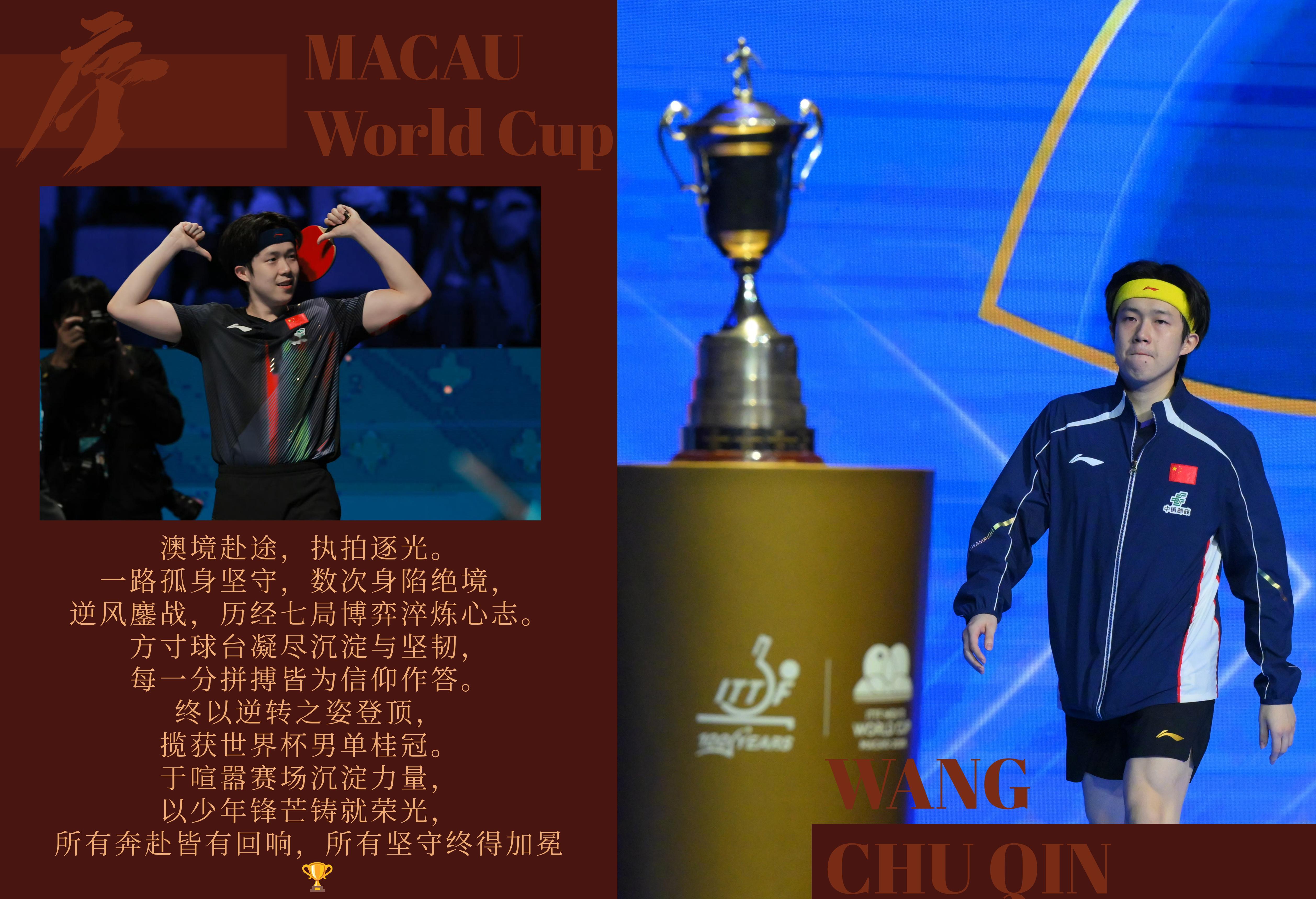 澳境赴途,执拍逐光。一路孤身坚守,数次身陷绝境,逆风鏖战,历经七局博弈淬炼心志。方寸球台凝尽沉淀与坚韧,每一分拼搏皆为信仰作答。终以逆转之姿登顶,揽获世界杯男单桂冠。于喧嚣赛场沉淀力量,以少年锋芒铸就荣光,所有奔赴皆有回响,所有坚守终得加冕🏆王楚钦