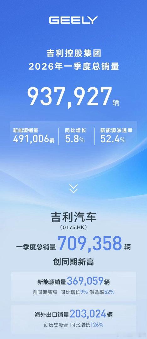 吉利一季度总销量93.79万辆,新能源卖了49.1万辆,渗透率直接来到52.4%;吉利汽车板块单季销量70.94万辆创历史同期新高,海外销量还同比暴涨126%。