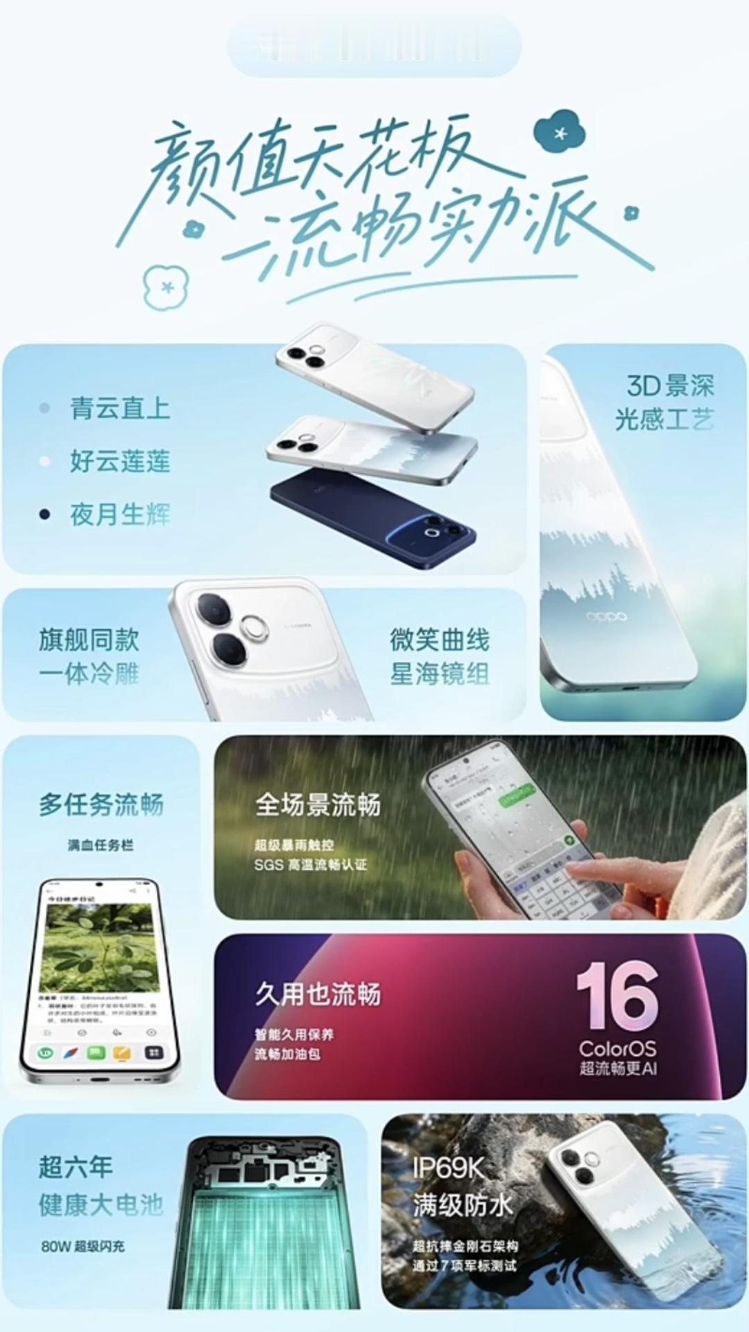 OPPO A6系列又有新成员,4月14日OPPO A6s Pro发布,A系列首款出厂搭载ColorOS 16的产机型,首销价格1999元起,可享国补。严格意义上说,并不是A6 Pro的升级,内存涨价压力实在很大。OPPO A6s Pro • 📱 6.57英寸120Hz直屏,1400尼特峰值亮度 • 🔋 7000mAh超大电池80W快充,支持6年健康使用 • 📷 5000万主摄 + 1600万前置 • 💧 IP69K满级防水,一键排水 • 🎨 行业首发「3D景深光感」「幻彩液晶」工艺 • [狗头] 新增128GB版本,支持扩展存储 • [黑线] 闪存降级为UFS 2.2 • [石化] 处理器降级为天玑6300 MAX