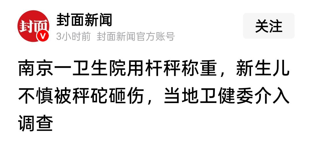 天呐!4天大的女婴,称量体重时被秤砣砸了胸口 你敢信?这都2026年了,还有工作人员拎着老式秤砣给新生儿称体重? 结果呢?布袋一滑,孩子摔了,秤砣紧接着砸下来,正中小婴儿的胸口! 哭声戛然而止……当妈的得有多崩溃? 事情发生在南京浦口区。4月12日下午,工作人员上门给出生才4天的女婴称重。用的不是电子秤,是那种带铁疙瘩的杆秤。 孩子妈妈后来跑了三家医院,凌晨发现尿不湿上有血,又冲去儿童医院。身心俱疲! 好在4月14日,社区卫生服务中心回应了:请了上级专家会诊,全力保证孩子健康。 但说句不好听的,事后补救再及时,也掩盖不了操作本身的荒唐啊! 卫健委的技术规范写得清清楚楚:新生儿称重要用杠杆式或电子体重秤,卧位称重。 杆秤是什么年代的东西?菜市场卖鱼都用电子秤了,你拿来称一个刚出生4天的孩子? 这不是有没有工具的问题,是脑子里的那根弦根本没上紧。 也提醒所有新手爸妈一句:遇到这种离谱操作,当场就该喊停。孩子的安全,经不起任何“差不多得了”。 希望宝宝平安无事。这事,必须给家长一个彻彻底底的交代。