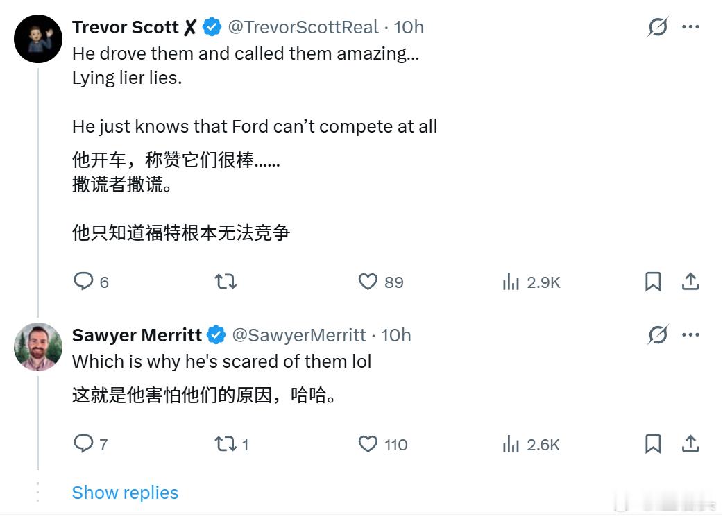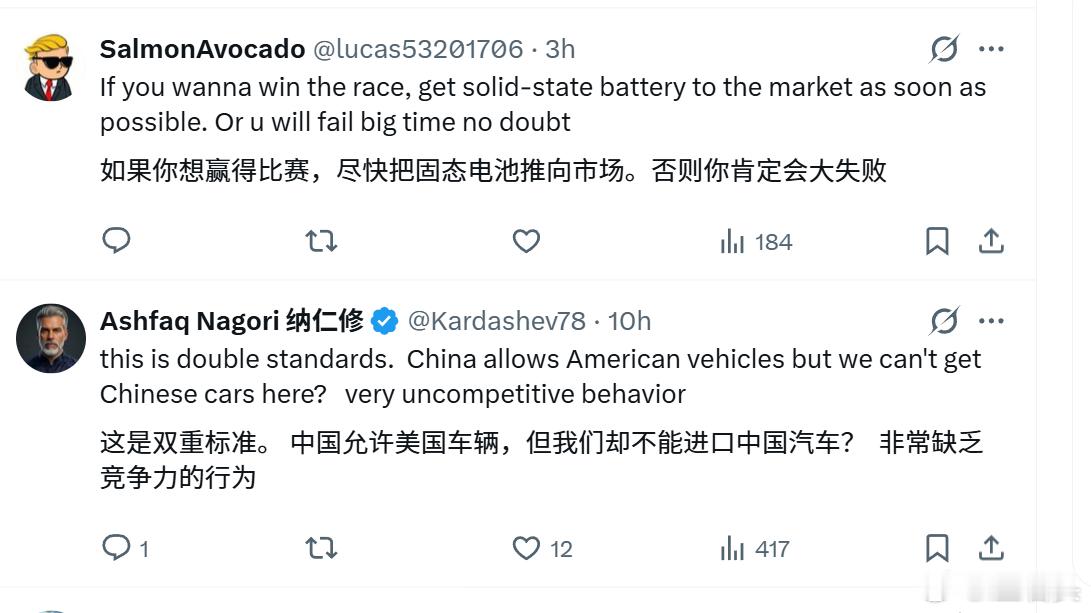 福特CEO反对中国车入美 歪果仁都很清醒的,这不就是这是双标嘛…中国可以卖美国汽车,而美国却不能进口中国汽车中国对福特、特斯拉等美国车企敞开大门但美国却从整车、零部件到软件技术,全面筑起高墙中国不仅允许合资,还在2018年取消了外资股比限制,允许外企独资建厂所以特斯拉从建厂到投产都极快,现在全球半数以上产能都来自中国竞争不过,就关上大门呗!!!竞争不过,就找水军污蔑呗、骂呗!!!双标老美,美国真坏