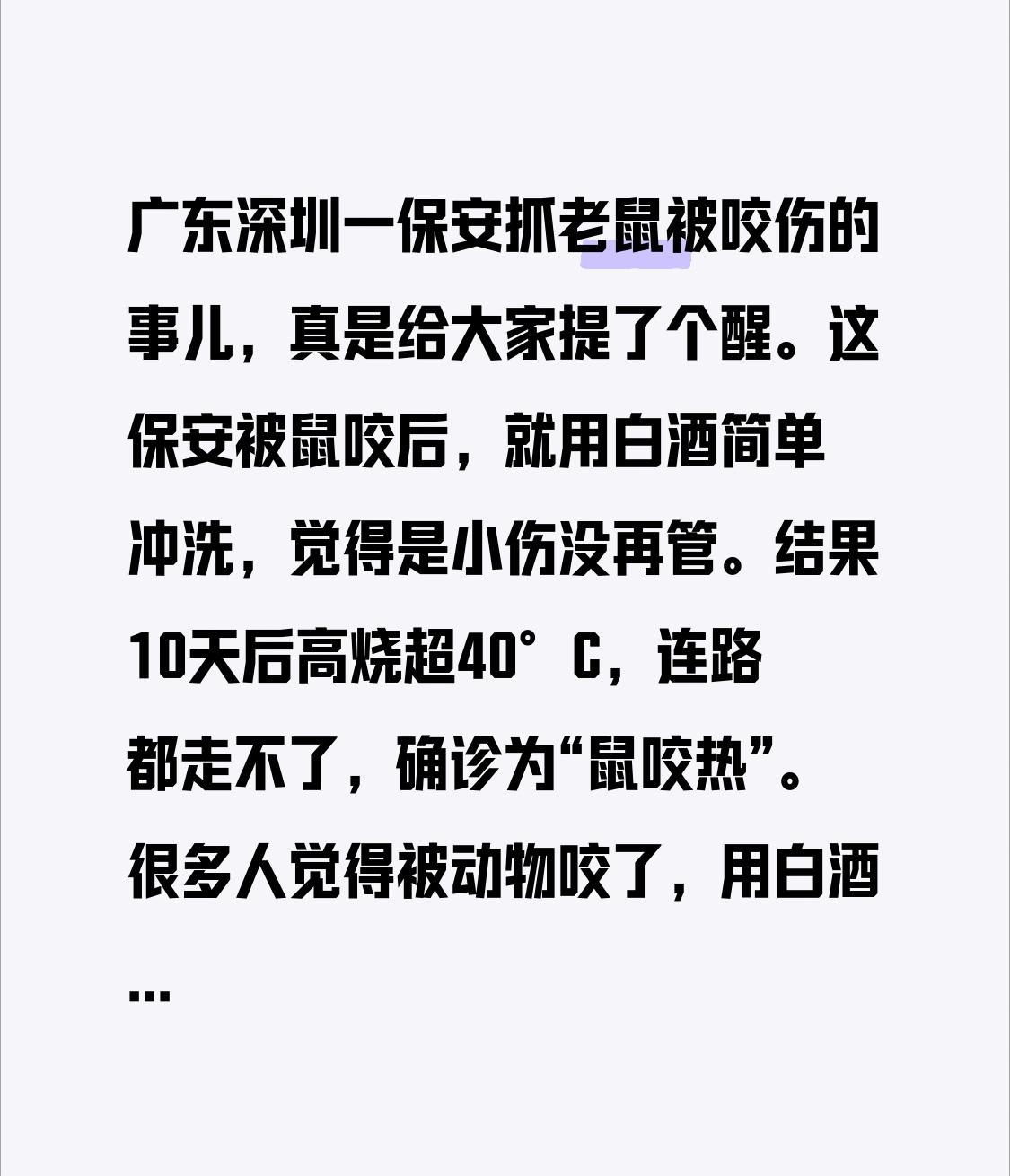 广东深圳一保安抓老鼠被咬伤的事儿,真是给大家提了个醒。这保安被鼠咬后,就用白酒简单冲洗,觉得是小伤没再管。结果10天后高烧超40°C,连路都走不了,确诊为“鼠咬热”。 很多人觉得被动物咬了,用白酒擦擦就行,这可大错特错。普通白酒杀菌效果有限,根本无法阻断潜在风险。鼠咬热初期症状像感冒、风湿,易被忽视。一旦延误治疗,可能引发败血症等严重并发症。 被动物咬伤后,得立即用肥皂水和清水交替冲洗至少15分钟,挤出污血,再用碘伏或酒精消毒,然后赶紧去医院。生命可不能心存侥幸啊!