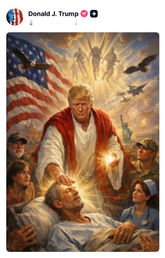 美国总统特朗普又干荒唐事了! 4月13号,他在自己的社交账号上发了一张图,居然把自己拍成了耶稣的样子。这事一出来,美国那边吵翻了天,全世界都在说他离谱。 说句实在的,特朗普这么做,要么是自大到没边,拿宗教当自己搞政治的工具,把自己吹成救世主;要么就是精神不正常了,根本不把宗教当回事,拿荒唐当本事,彻底暴露了他的偏执和疯狂。 咱们先说说这张图到底长啥样,离谱到啥程度。这张图是AI做的,特朗普穿着红白长袍,就是咱们平时看耶稣画像里那种衣服,专门用来表现耶稣复活的。 他一只手摸着病人的额头,手心还发光,跟耶稣治病救人一模一样。更可笑的是,图片背景里还混着自由女神像、烟花、战斗机这些代表美国的东西,明摆着就是想让大家觉得,他既能拯救美国,又能像耶稣一样拯救所有人。 这事可不是咱们瞎编,美国《华盛顿邮报》当天就报道了。图一发出来,立马就有人骂他,就连之前一直支持他的基督教信徒,这次也站出来反对。 有个以前帮共和党做事的人,直接在网上说,这是不尊重信仰,特朗普行不行大家都看得到,没必要把自己吹成救世主。还有人直接质问他,真把自己当耶稣了?做人谦虚点,别随便轻慢上帝。 可能是骂他的人太多,特朗普当天就把图删了,但他不光不道歉,还嘴硬说大家解读错了,说这是假新闻。 有记者在白宫碰到他吃麦当劳,问起这事,他居然说没看出来是耶稣,还以为是医生,嘴硬说“我能让人变好”。这话听着就可笑,明眼人都能看出来是耶稣,他非说是医生,纯属不想认错,死要面子。 要知道他这事有多离谱,得先说说耶稣在基督教里的地位。耶稣是基督徒心里的神的儿子,是救世主,大家都觉得他是来拯救世人的,圣诞节、复活节都是纪念他的,在信徒眼里,耶稣是神圣的,谁也不能随便拿自己跟他比,这是最基本的规矩。 而且特朗普也不是第一次拿宗教搞事了。之前教皇去世,他发过自己扮教皇的图,还开玩笑说想当下一任教皇,当时就惹恼了不少天主教徒。这次又自比耶稣,根本不是一时糊涂,背后全是小心思。 要么就是他太自大,一辈子都觉得自己最厉害,现在又要竞选总统,就想把自己吹成救世主,拿宗教讨好信教的选民,为自己拉票,把宗教当成了搞政治的工具。他本身也不是多虔诚的信徒,却总拿宗教说事,这次玩过了火,反而被人骂。 要么就是他精神真的不正常了。他今年都78岁了,近几年干的荒唐事越来越多,说的话也越来越离谱,一会儿说要接管加沙,一会儿说要把加拿大变成美国的一个州,完全不讲规矩。 这次自比耶稣,更是把他的疯狂暴露得明明白白,正常人都知道不能这么做,他却毫不在意,眼里只有自己的利益。 说到底,特朗普发图自比耶稣,就是一件既不尊重宗教,又暴露自己问题的荒唐事。不管他是自大还是精神失常,都能看出来,他根本不在乎别人的感受,只在乎自己的政治利益。 这种连基本规矩都不遵守的人,要是继续当总统,只会给美国添乱,也会给世界带来麻烦。