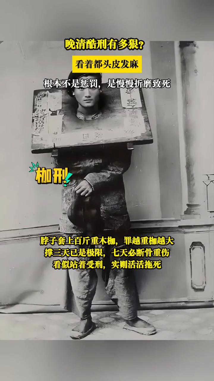 晚清酷刑有多狠?看着都头皮发麻。 ·枷刑:脖子套上百斤重木枷,罪越重枷越大。撑三天已是极限,七天必断骨重伤。看似站着受刑,实则活活拖死。晚清这6种酷刑比欣头还狠,活着比死更绝望! ·站笼:头被卡死在笼顶,脚下只垫几块砖。抽一块砖少一口气,三块砖抽完直接窒息。想死都得站着死。 ·墩锁:专罚女犯,塞进狭小木箱只露手脚。扔在荒原,任由风吹日晒。渴饿、野兽轮番折磨,史料都不忍细写。 ·流放:看着普通,下手全是门道。行刑人稍一用力,三十杖就能打瘫。五十杖直接毙命,生死全在一念之间。流放三千里,限期是两个月。饥寒、瘴气、差役勒索,能活到宁古塔的不到三成。 这些酷刑是晚清统治的恐怖一面,也是文明进程里的黑暗一页。