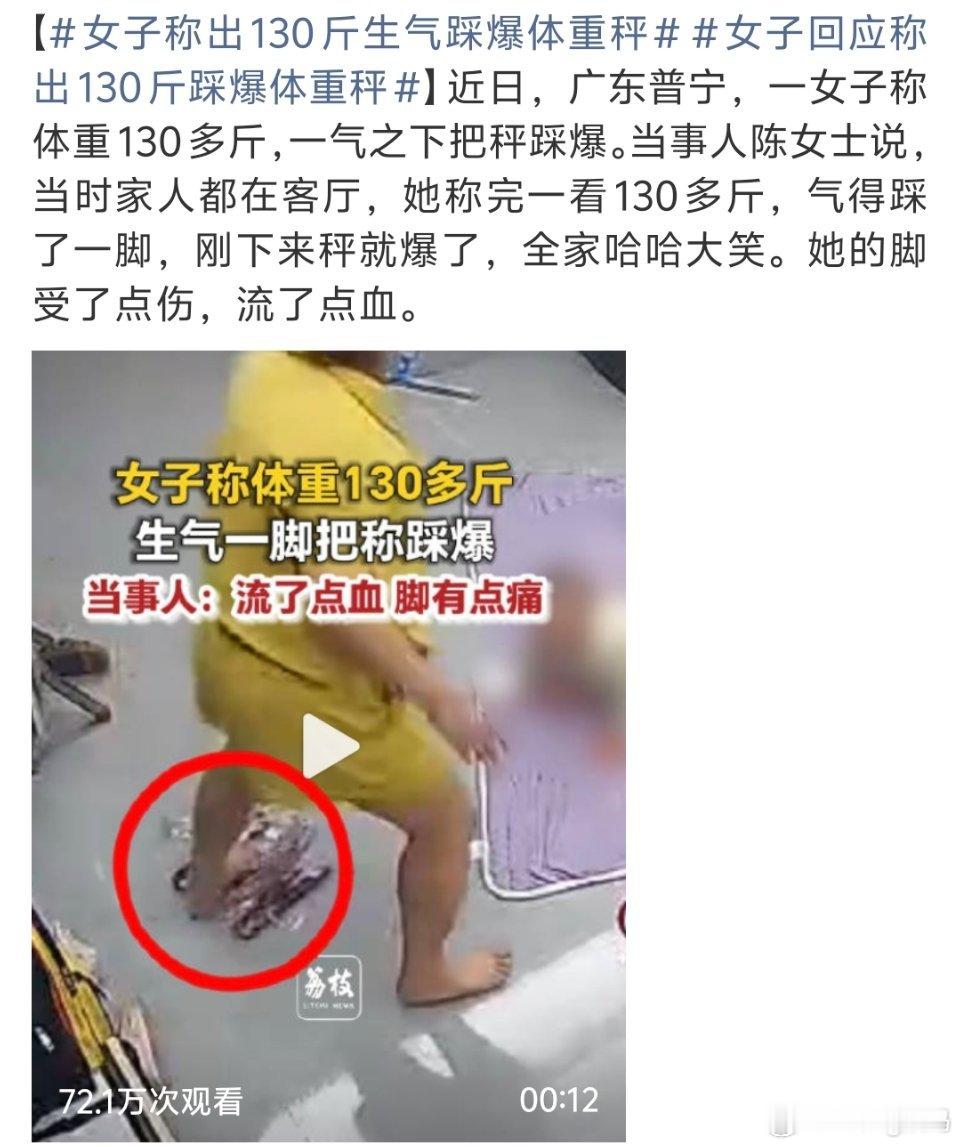 女子称出130斤生气踩爆体重秤太强了果然是一生气就开启无痛buff吗?还是要对自己的身体好点