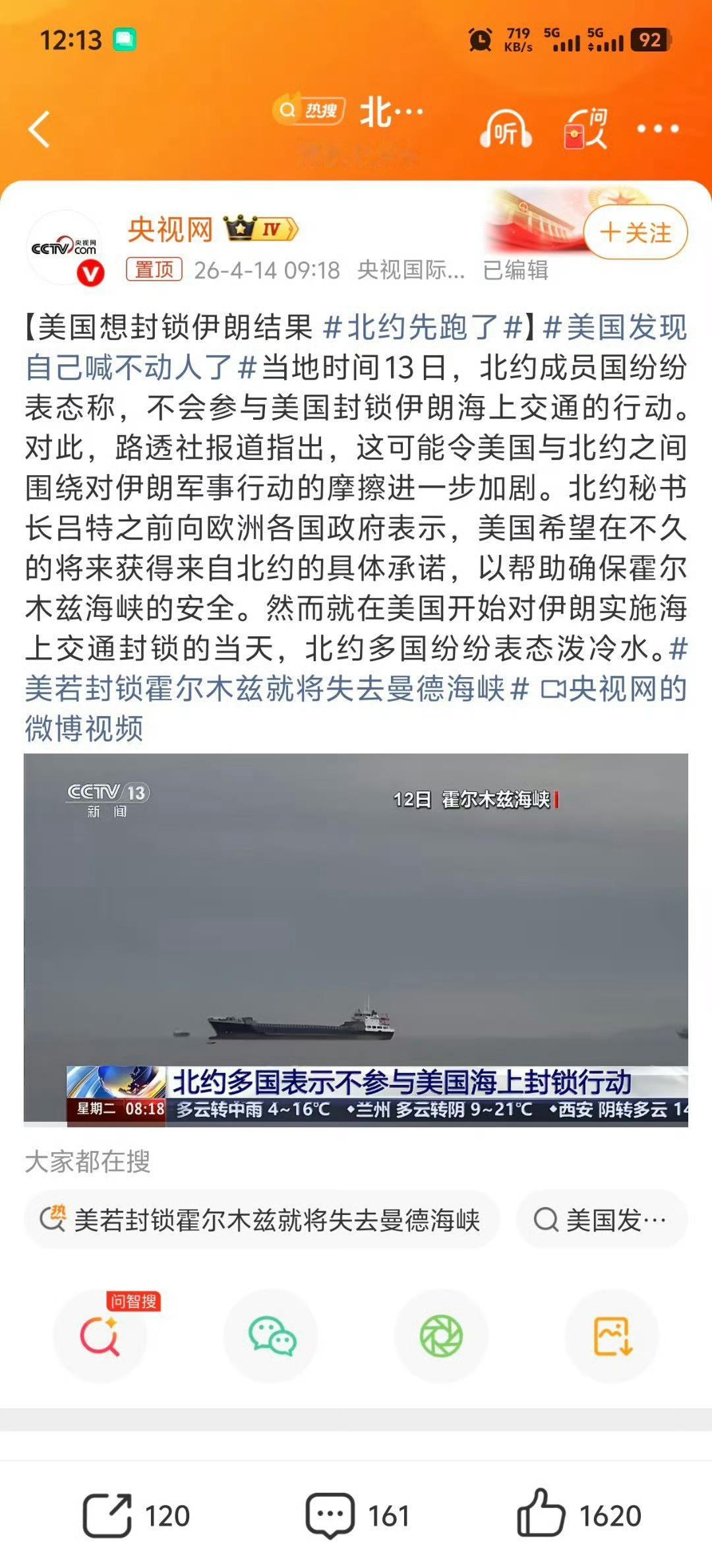 北约先跑了这老北鼻被打脸了!北约成员国纷纷表态称,不会参与美国封锁伊朗海上交通的行动。