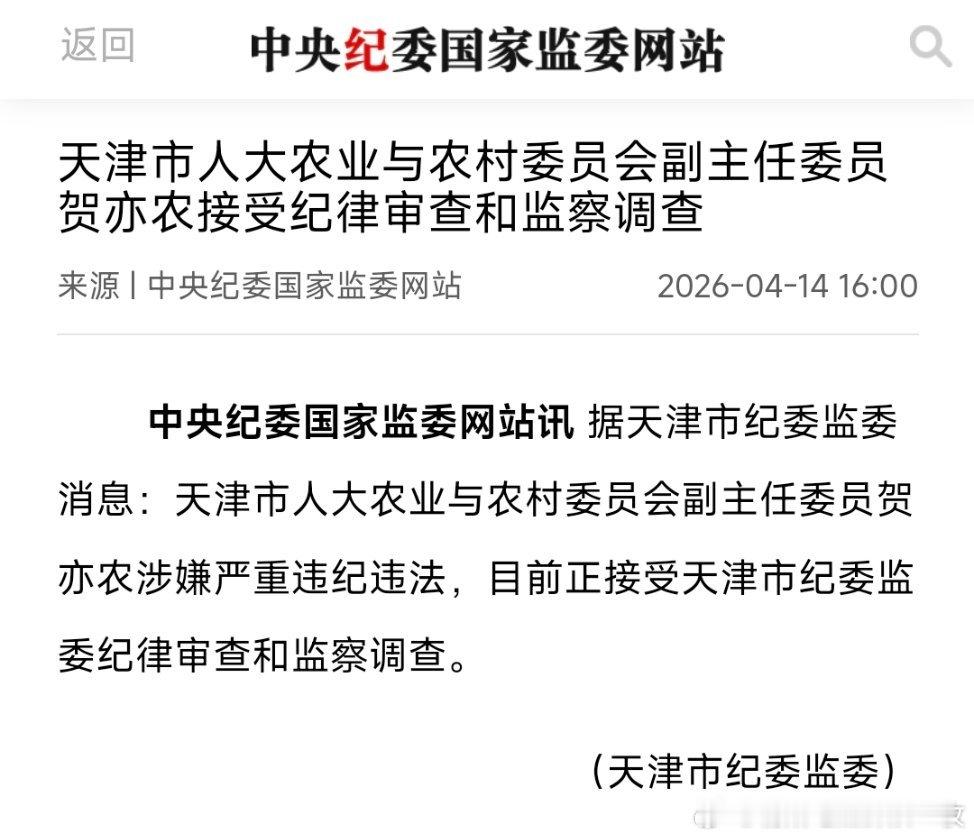 天津市人大农业与农村委员会副主任委员贺亦农接受纪律审查和监察调查,曾任天津市津南区区长、和平区委书记、蓟州区委书记等职。