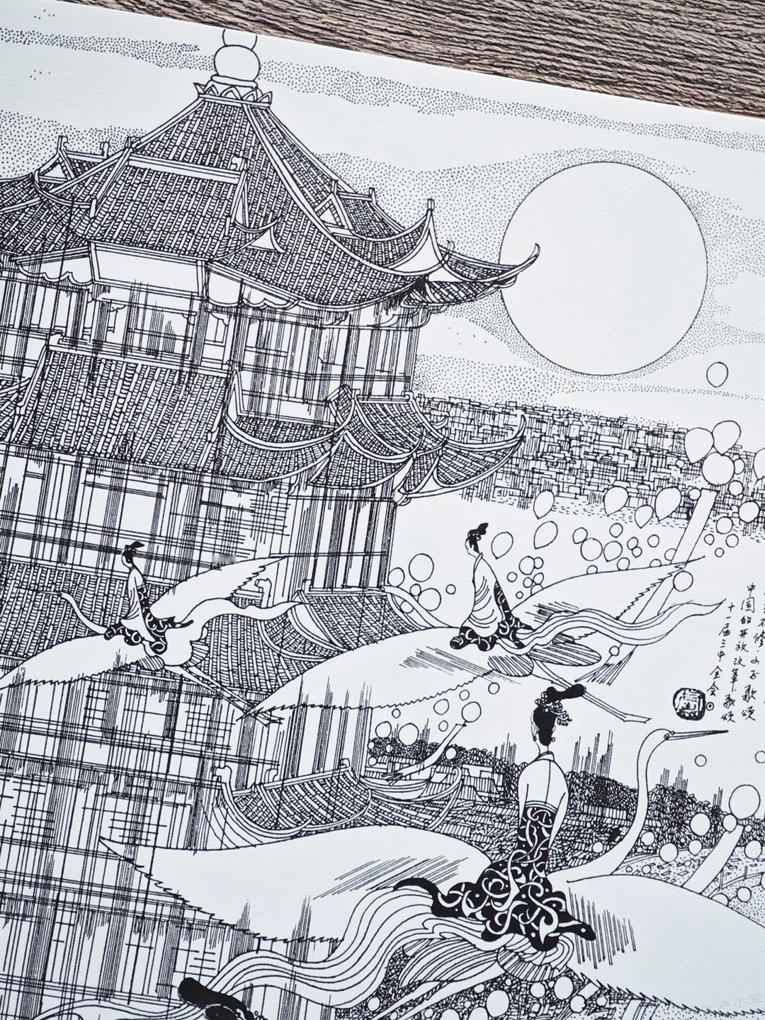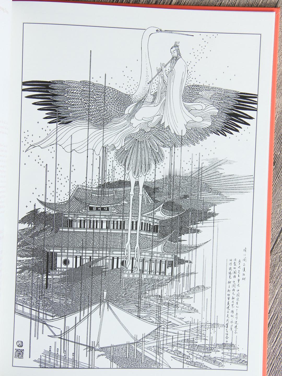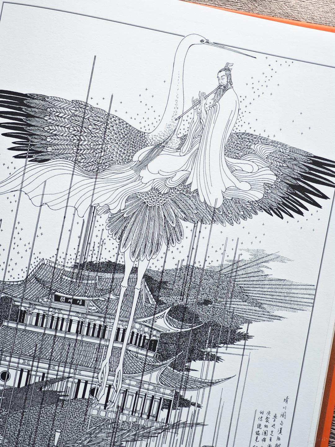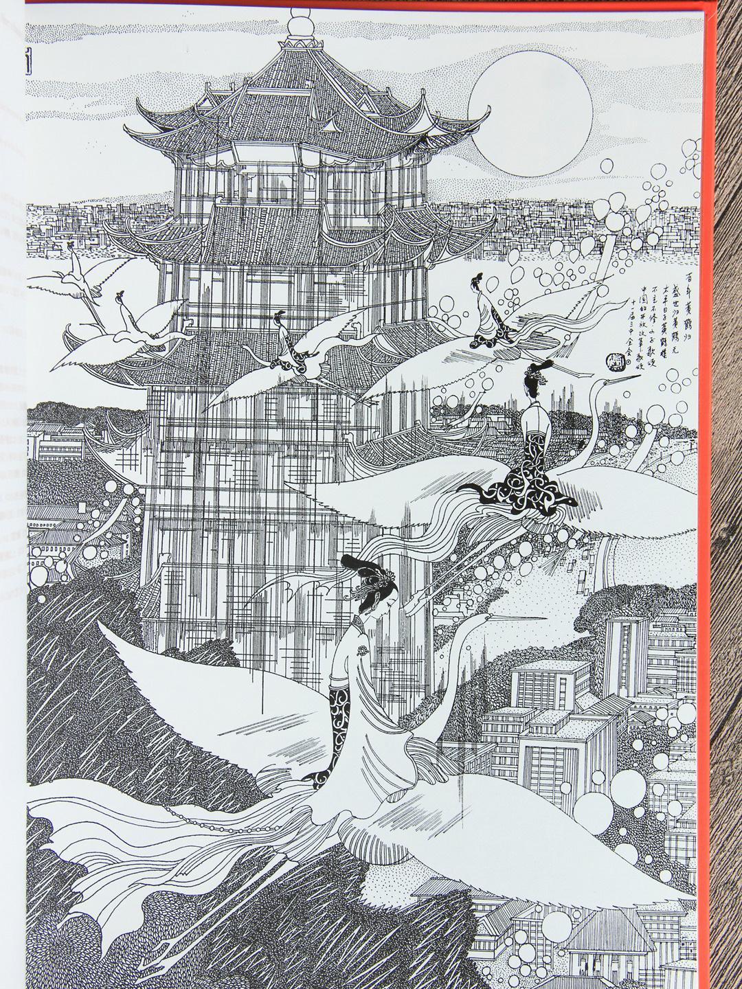 卢延光《黄鹤楼传说》欣赏2 请继续欣赏1988年由卢延光、蒙复旦和江郁之合作的诗画集《黄鹤楼传说》,全书共40个小故事,0.2mm粗细的笔尖勾线,用了大量的曲线直线,黑色白色对比来组合出奇幻效果,很装饰很夸张,而又能不失中国风韵味,这种画风在当年很有开创性。