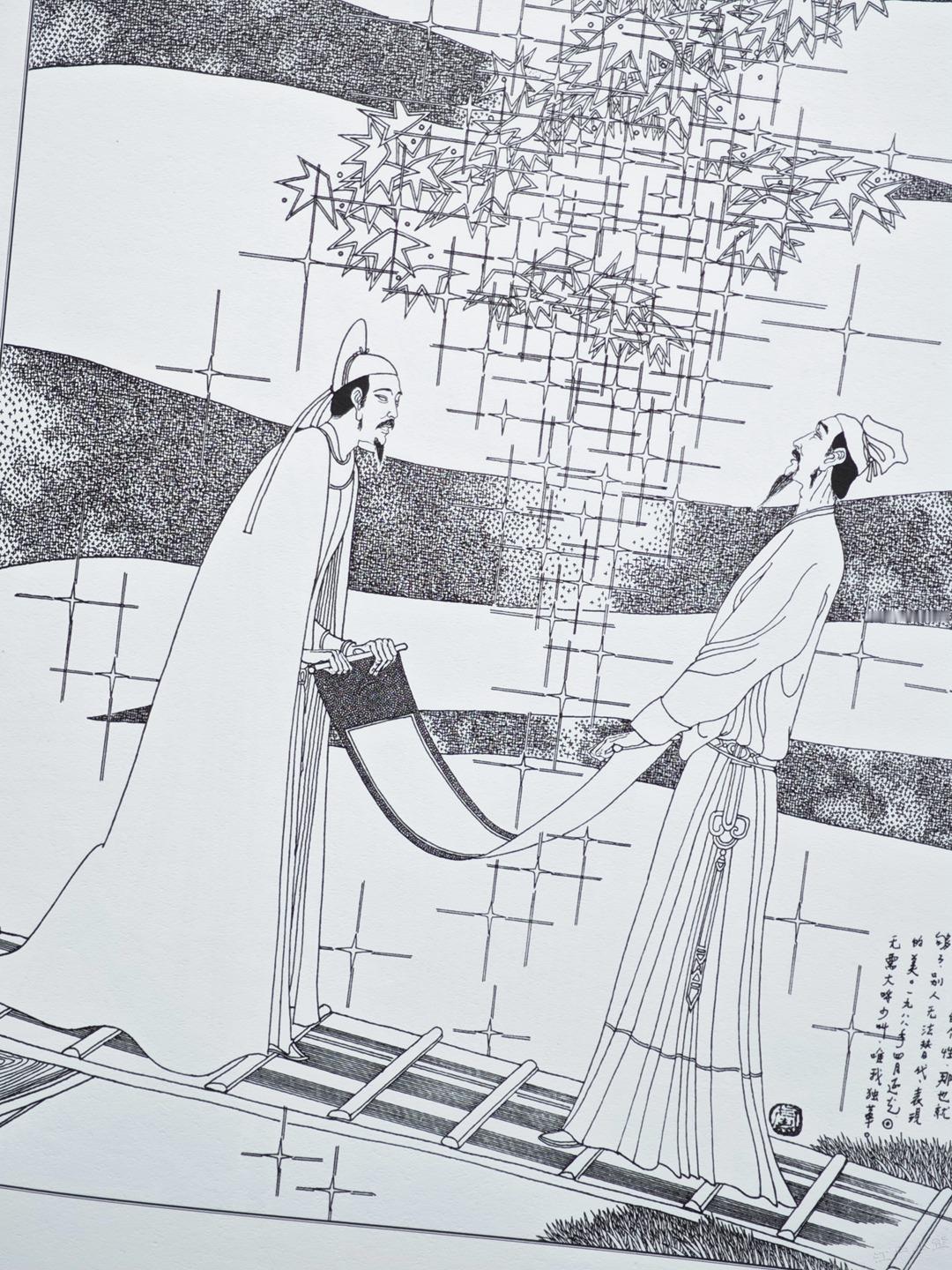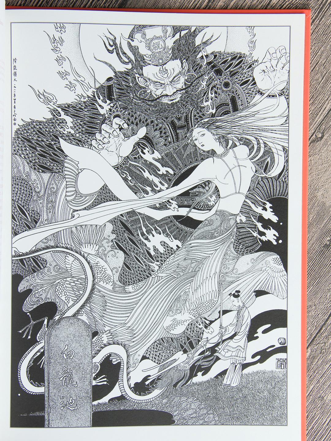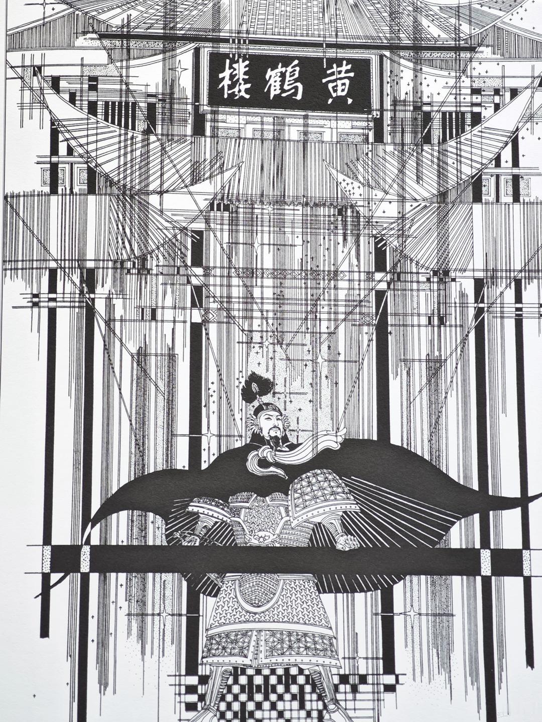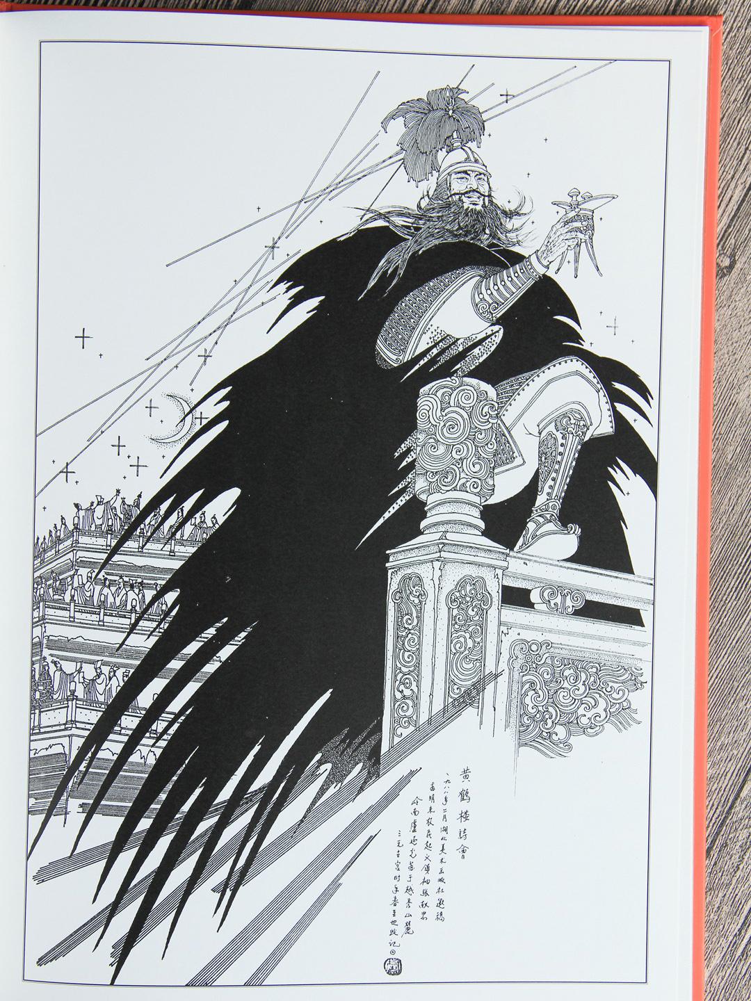 卢延光《黄鹤楼传说》欣赏2 请继续欣赏1988年由卢延光、蒙复旦和江郁之合作的诗画集《黄鹤楼传说》,全书共40个小故事,0.2mm粗细的笔尖勾线,用了大量的曲线直线,黑色白色对比来组合出奇幻效果,很装饰很夸张,而又能不失中国风韵味,这种画风在当年很有开创性。