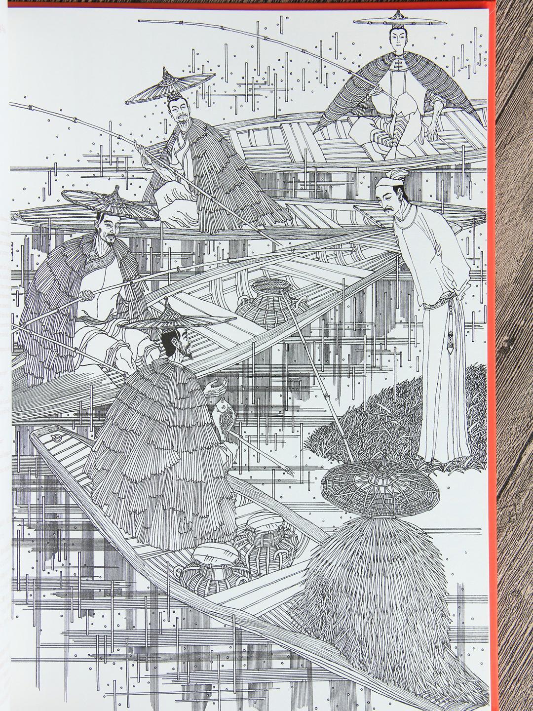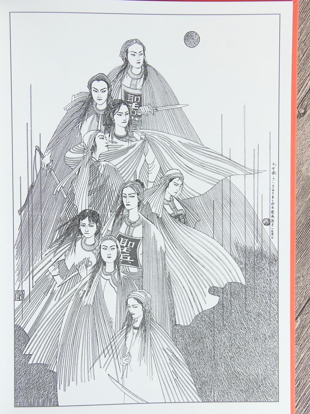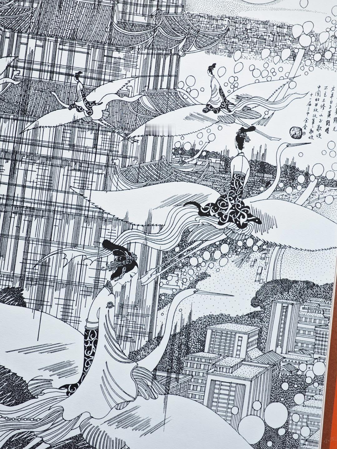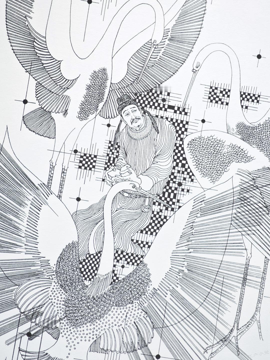 卢延光《黄鹤楼传说》欣赏2 请继续欣赏1988年由卢延光、蒙复旦和江郁之合作的诗画集《黄鹤楼传说》,全书共40个小故事,0.2mm粗细的笔尖勾线,用了大量的曲线直线,黑色白色对比来组合出奇幻效果,很装饰很夸张,而又能不失中国风韵味,这种画风在当年很有开创性。