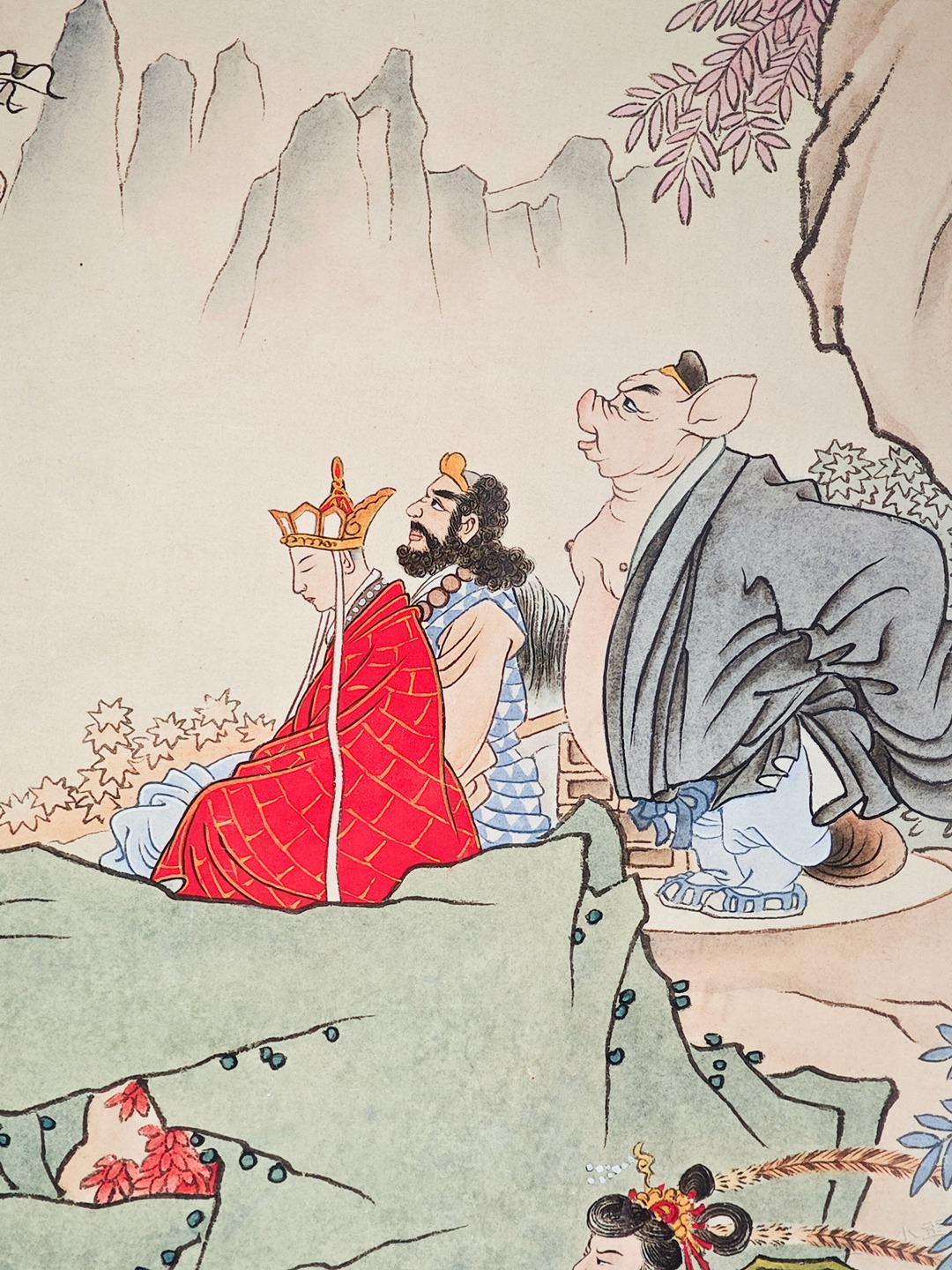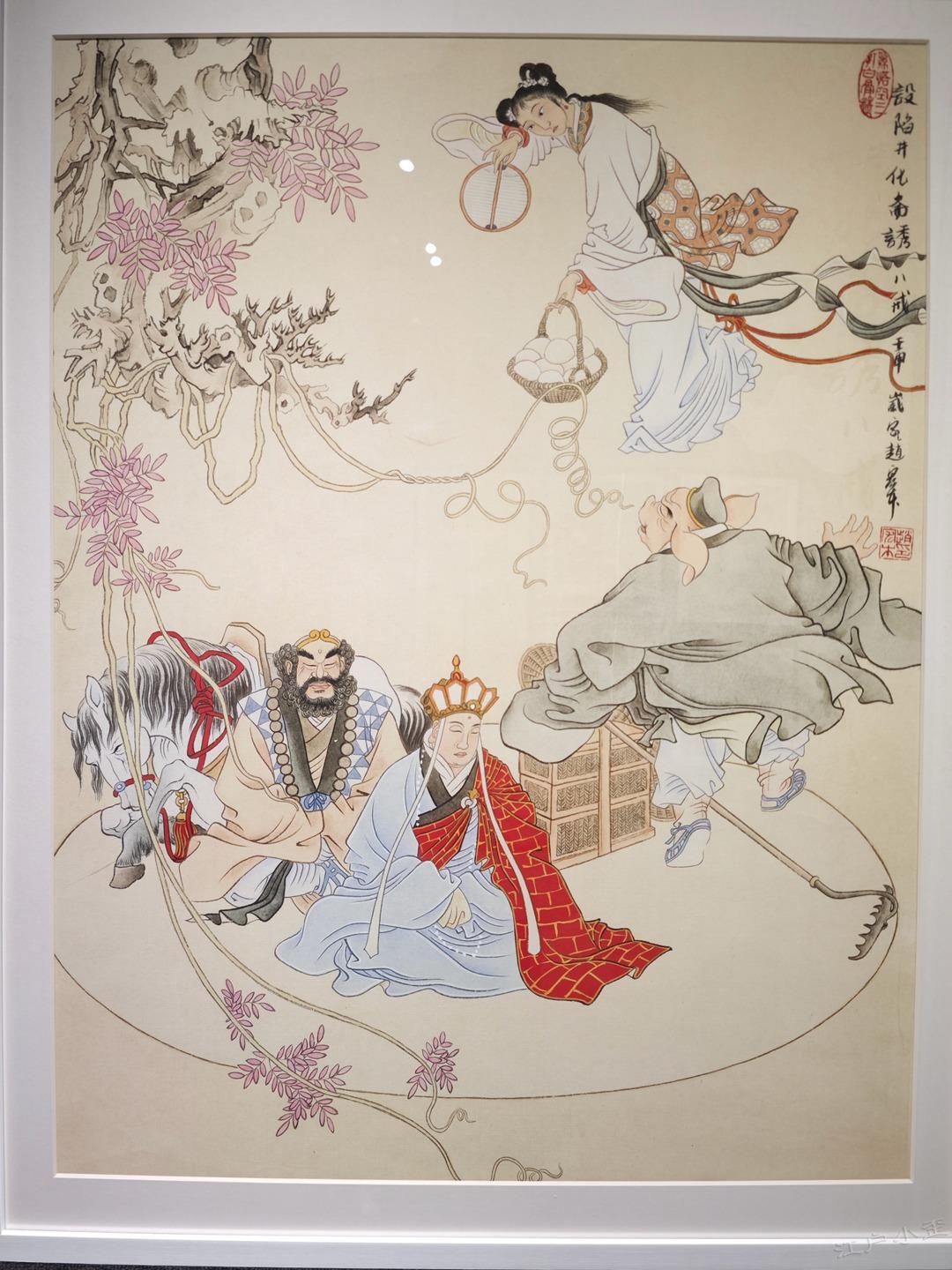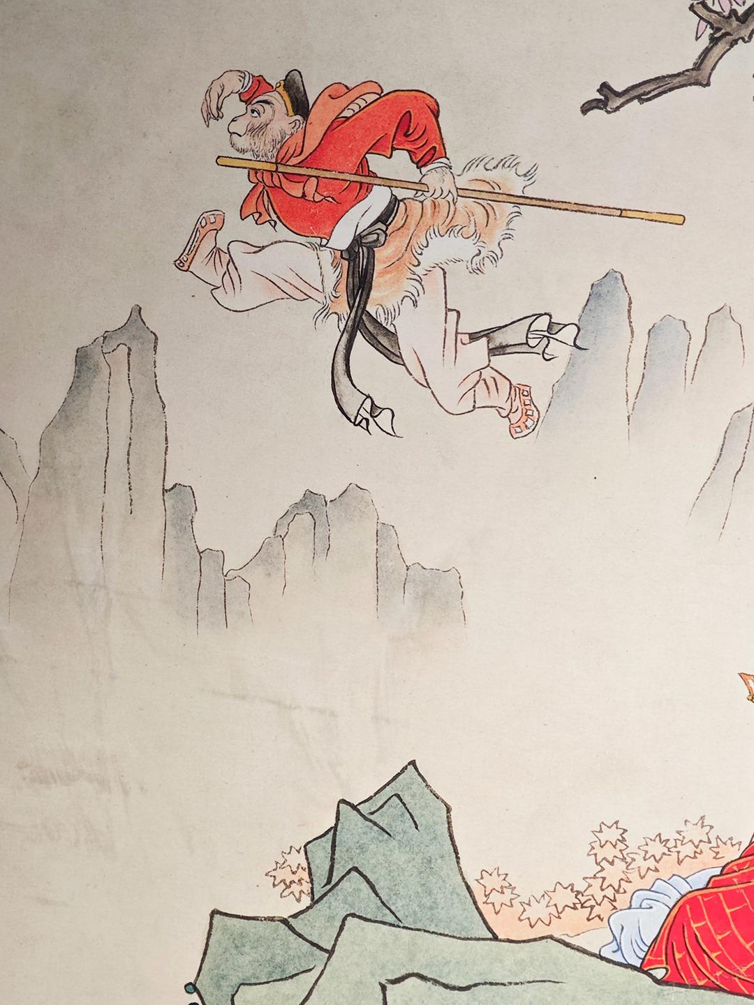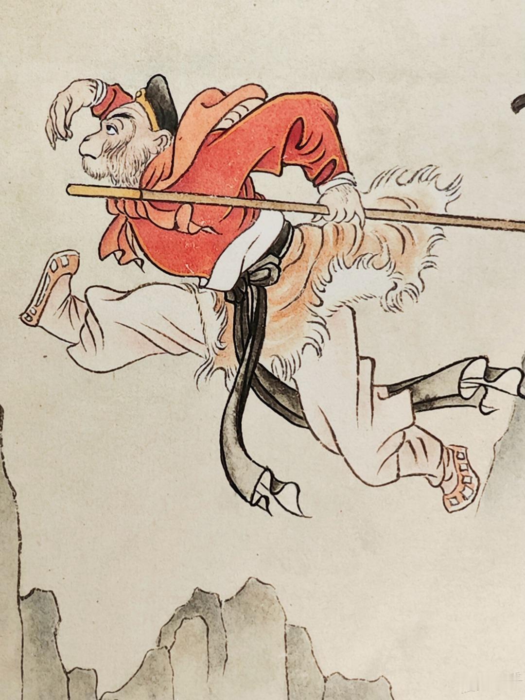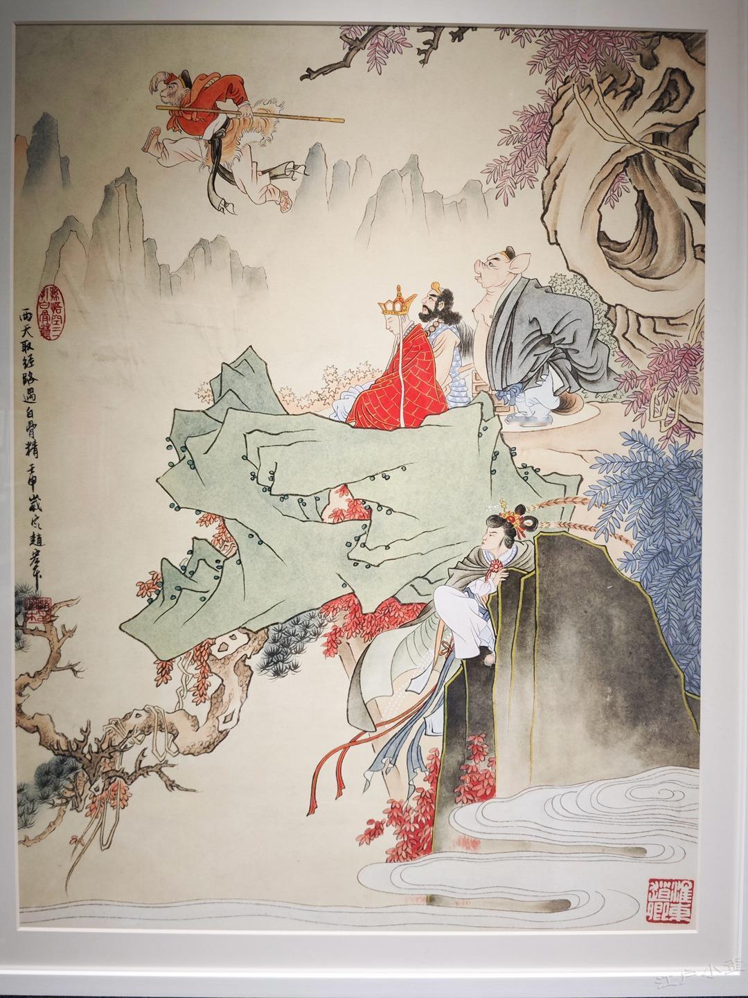 《孙悟空三打白骨精》彩色原稿欣赏 赵宏本和钱笑呆先生1962年合作的《孙悟空三打白骨精》是一代白描连环画经典,1963年二人也完成了彩色版12幅的年画,线稿彩稿,珠联璧合。 今年新春我在广州美术馆看到了《三打》画稿真迹,尺寸大约是16开,只是觉得画稿纸张发皱,而且玻璃隔得太远,看不真切。 随后我赶往广州人民艺术中心,看到了超大的《三打》展板,约较原稿放大了四倍,基本保持了清晰度,且画稿处理得非常清爽干净,够大才够爽。 一旁还有赵宏本先生亲笔说明,原来1992年的时候,赵老听闻初代原稿被毁,老搭档钱笑呆也不在了,他独自提笔重描了这部彩色经典。 这部重描的画稿后来被漫画家金城先生收藏,广州美术馆展示的是真迹,而同期在广州人艺有放大的仿制品,如果不是特别仔细都看不出是仿制品,看起来挺过瘾的,故而将照片细节陆续晒出,画面和初代画稿肯定不能比了,体谅赵老当时已经是近80岁高龄,实属不易,也有欣赏价值,请各位参详。