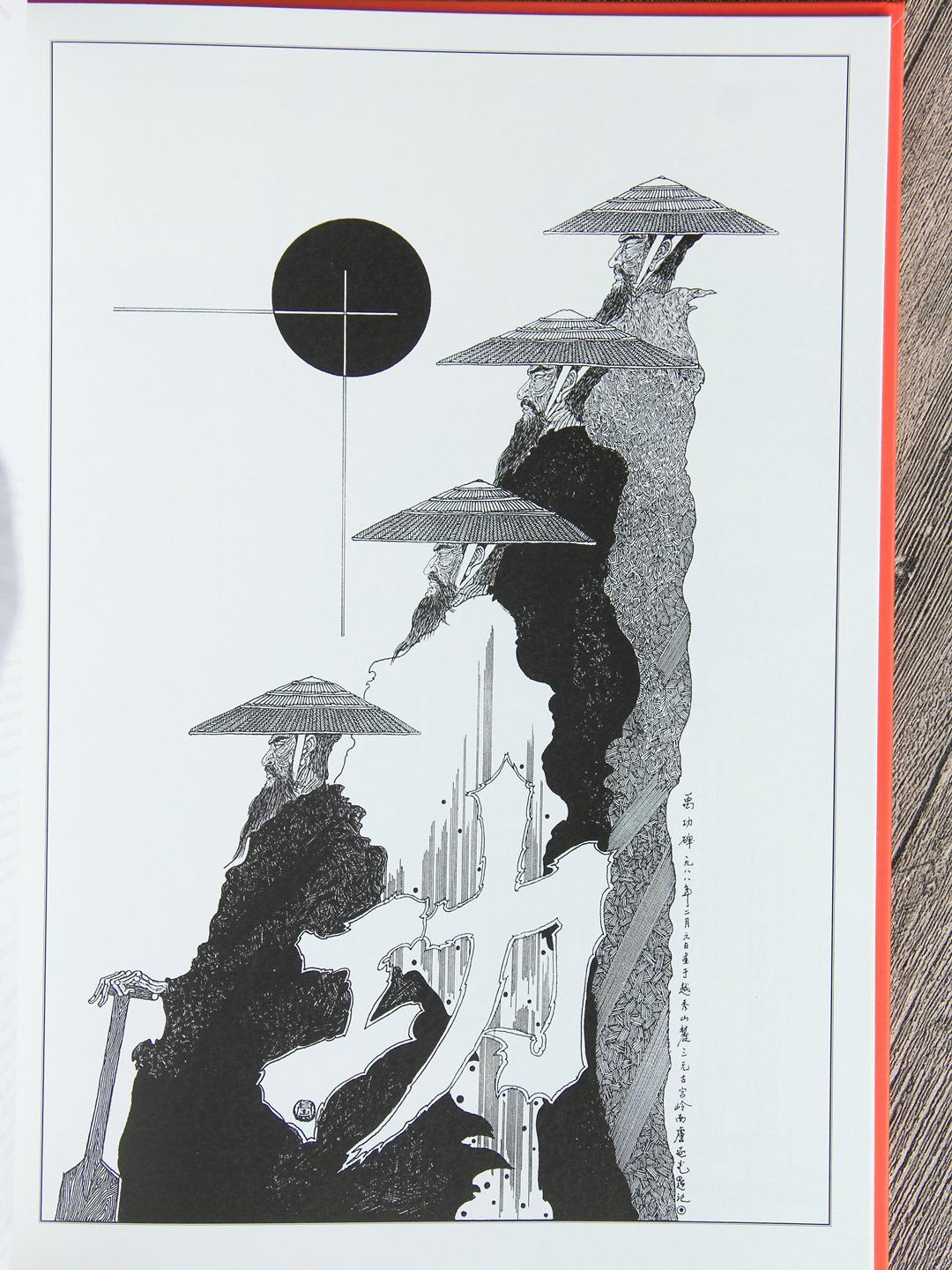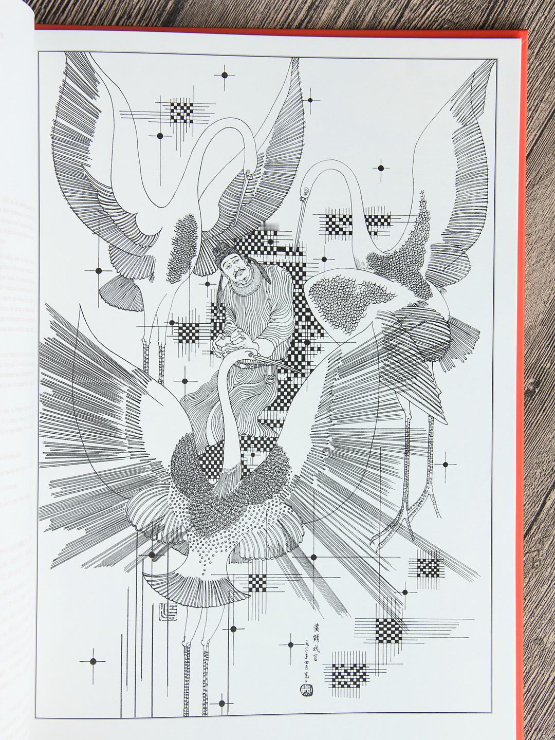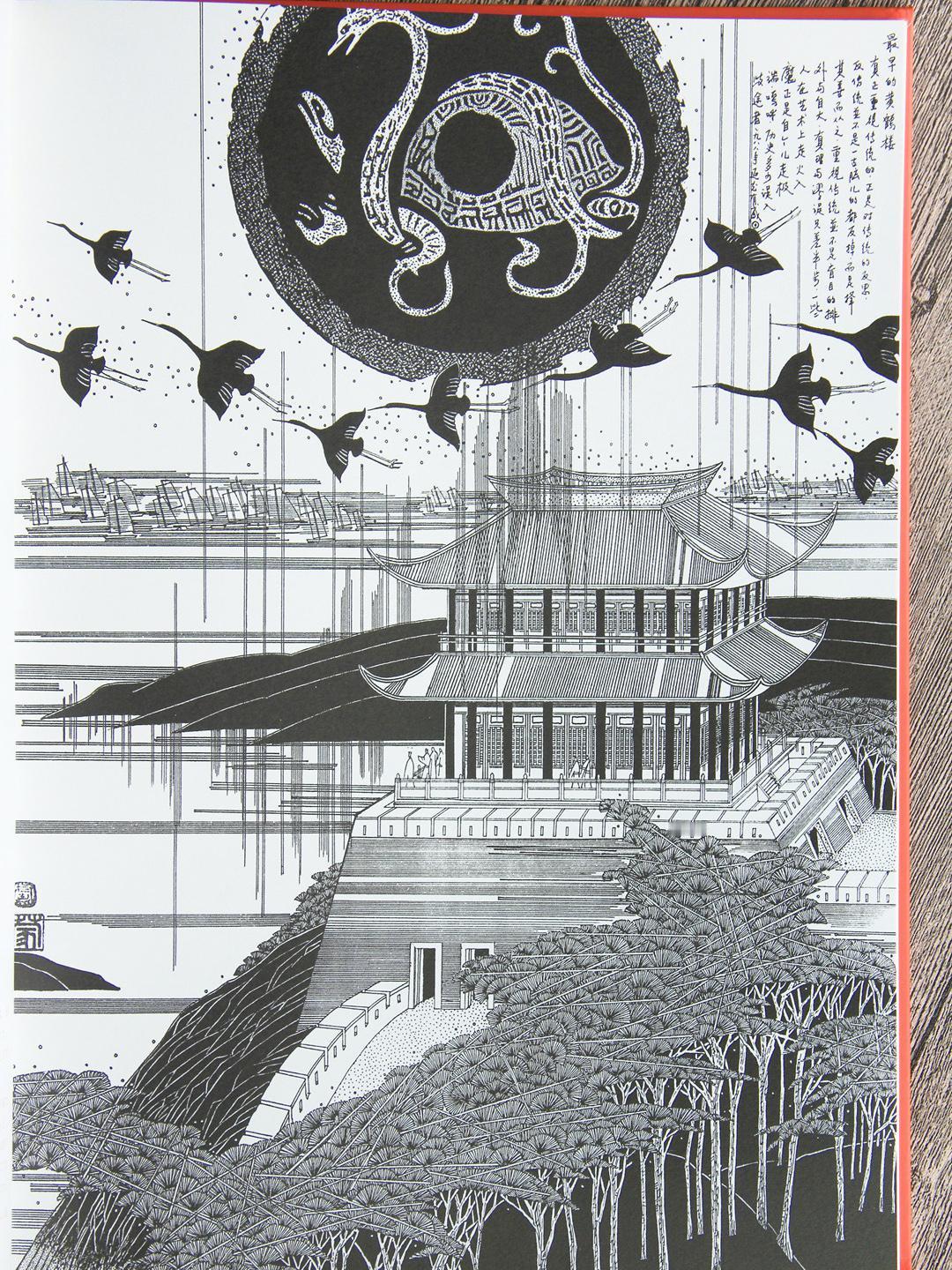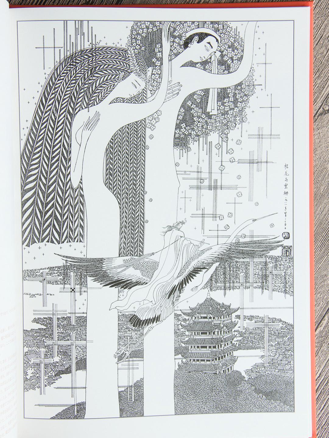 请继续欣赏1988年由卢延光、蒙复旦和江郁之合作的诗画集《黄鹤楼传说》,极细的笔可以千变万化,借鉴融合了西方插画比亚兹莱、蒙德里安等人的技法,现在湖北美术将之原大8开精装再次出版,再次弘扬了黄鹤楼千年文化和近代装饰艺术。