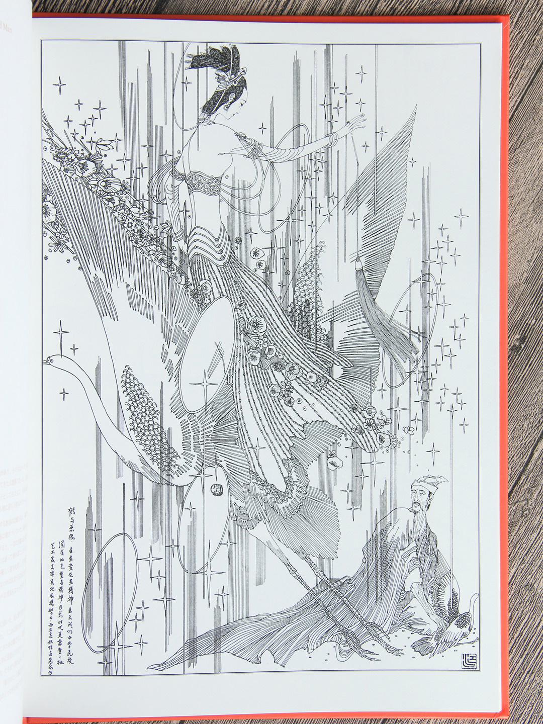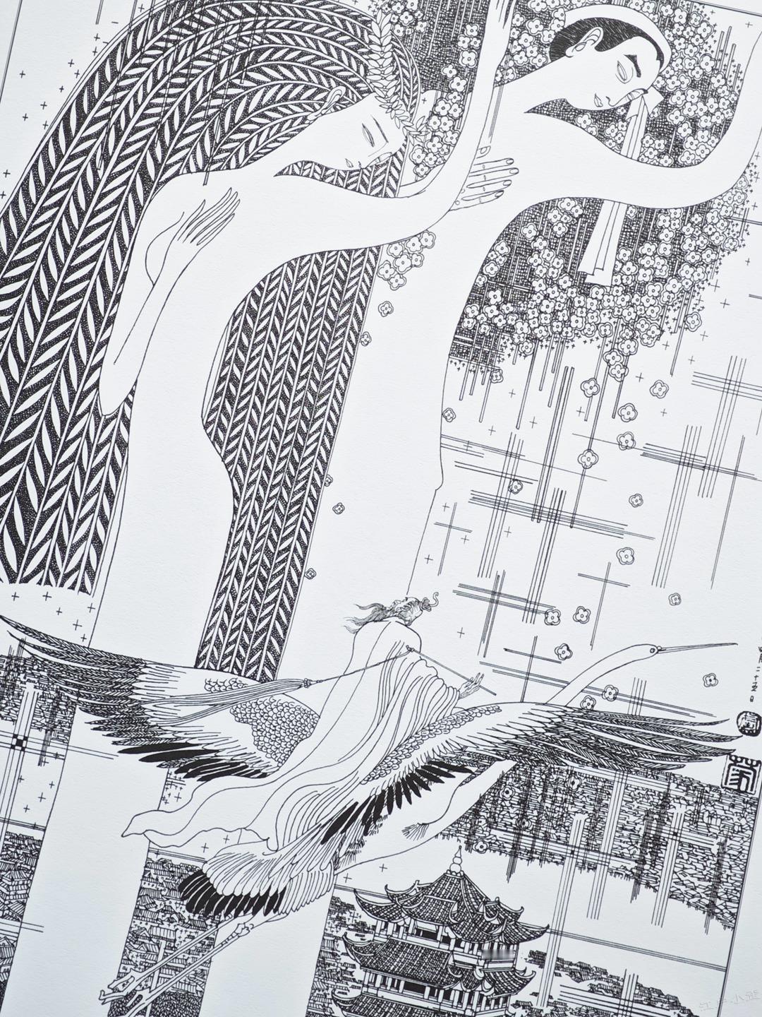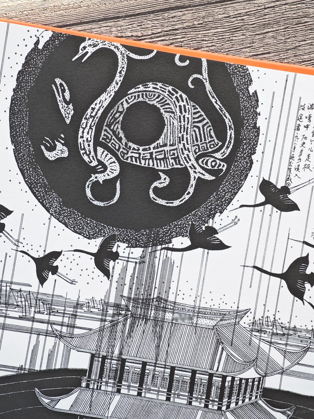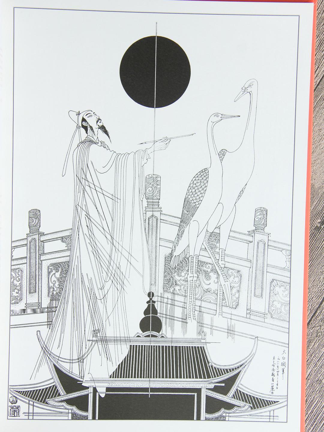 请继续欣赏1988年由卢延光、蒙复旦和江郁之合作的诗画集《黄鹤楼传说》,极细的笔可以千变万化,借鉴融合了西方插画比亚兹莱、蒙德里安等人的技法,现在湖北美术将之原大8开精装再次出版,再次弘扬了黄鹤楼千年文化和近代装饰艺术。