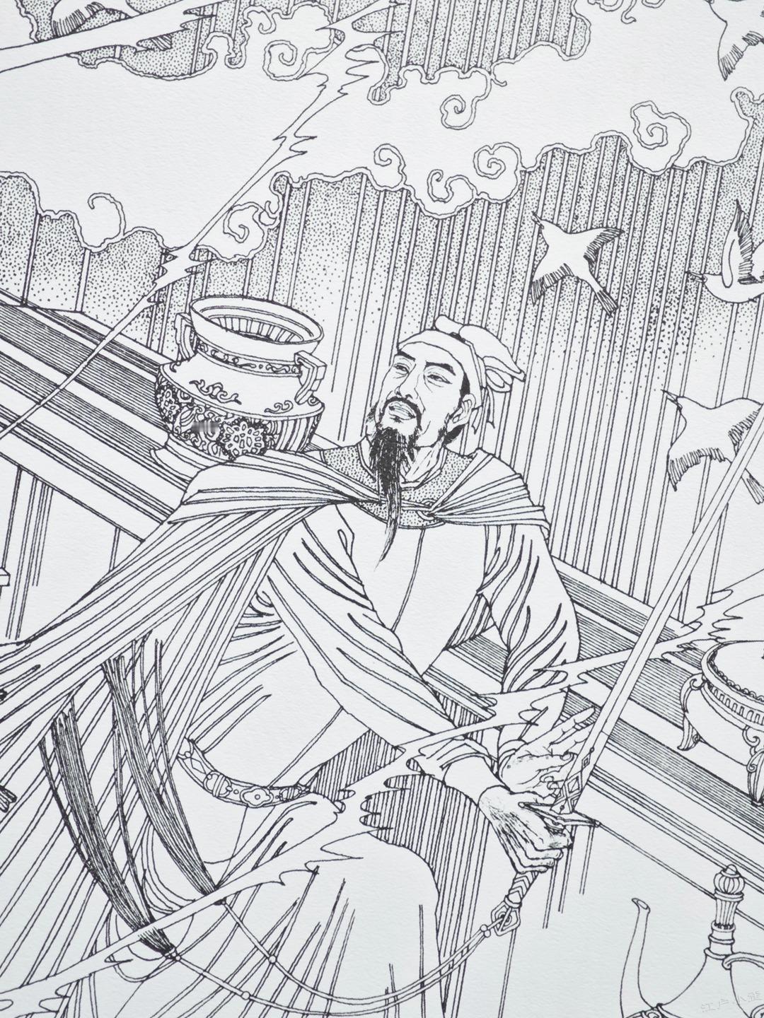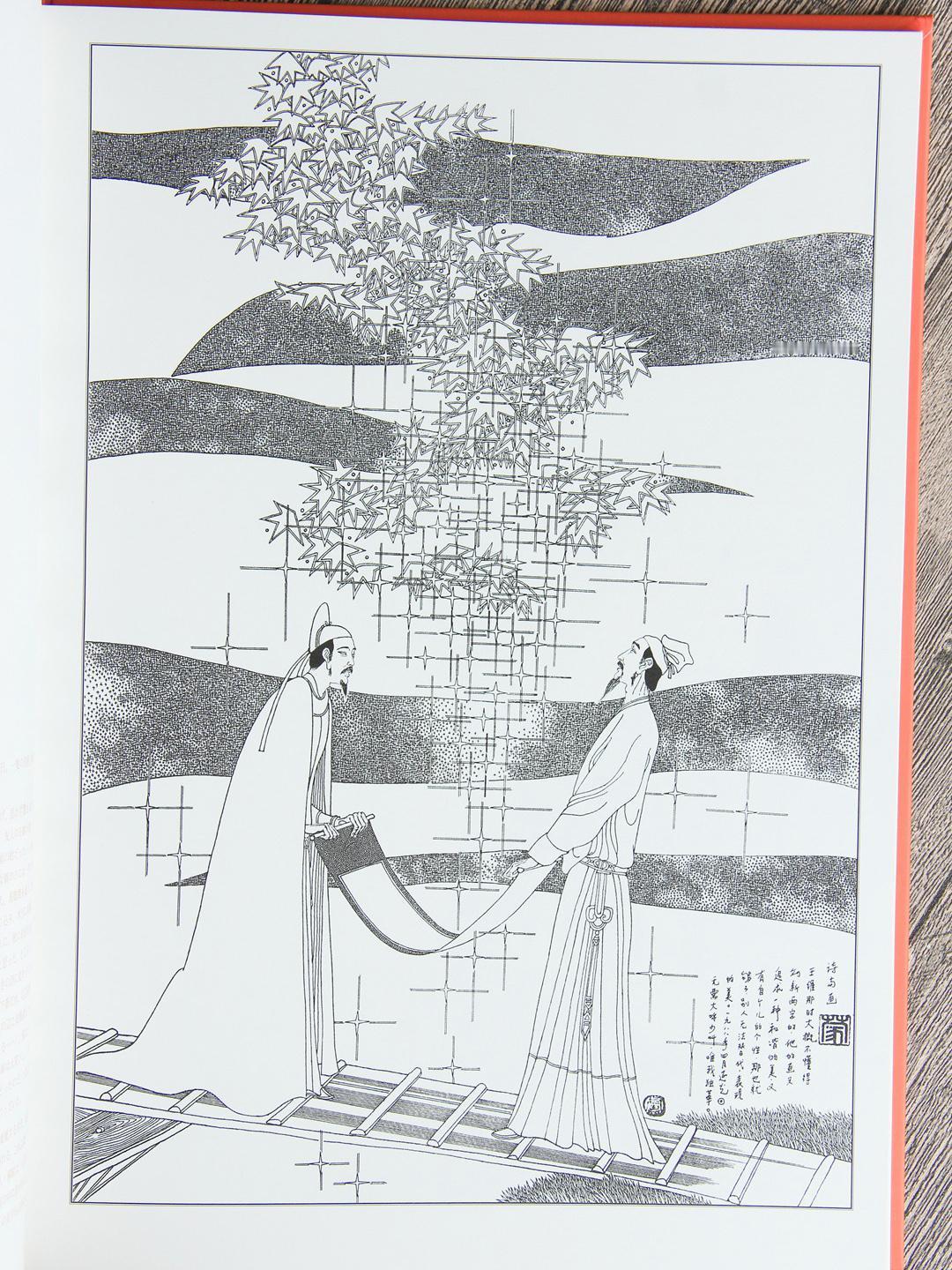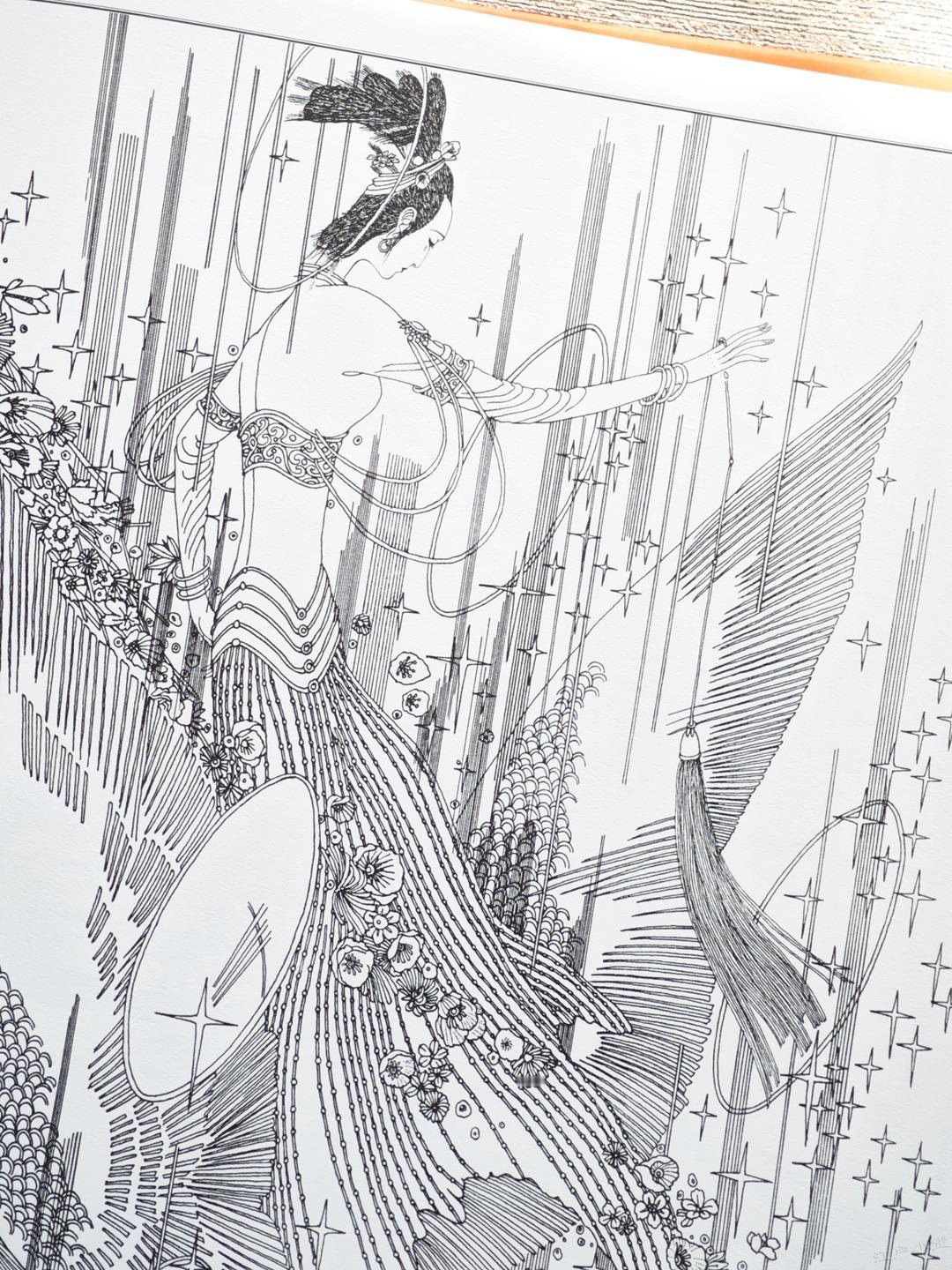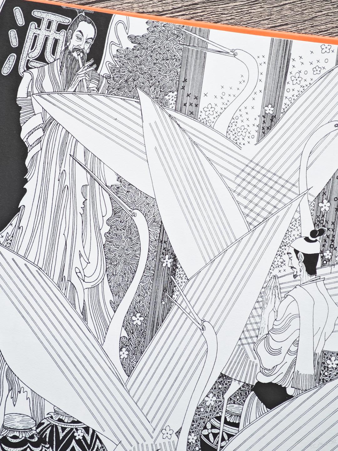 请继续欣赏1988年由卢延光、蒙复旦和江郁之合作的诗画集《黄鹤楼传说》,极细的笔可以千变万化,借鉴融合了西方插画比亚兹莱、蒙德里安等人的技法,现在湖北美术将之原大8开精装再次出版,再次弘扬了黄鹤楼千年文化和近代装饰艺术。