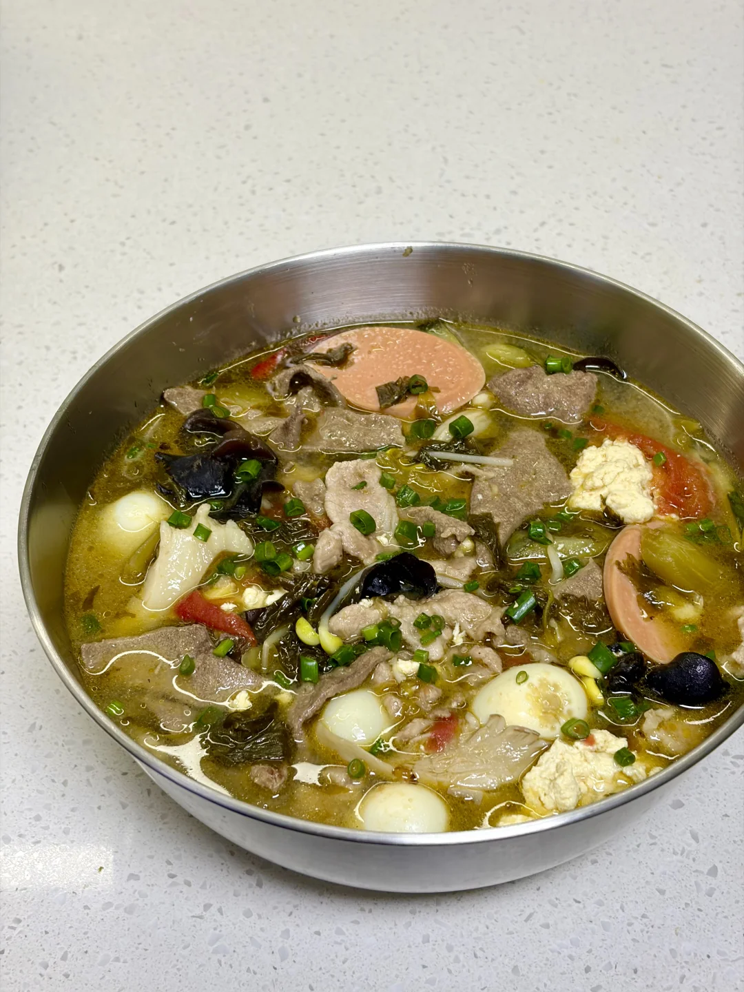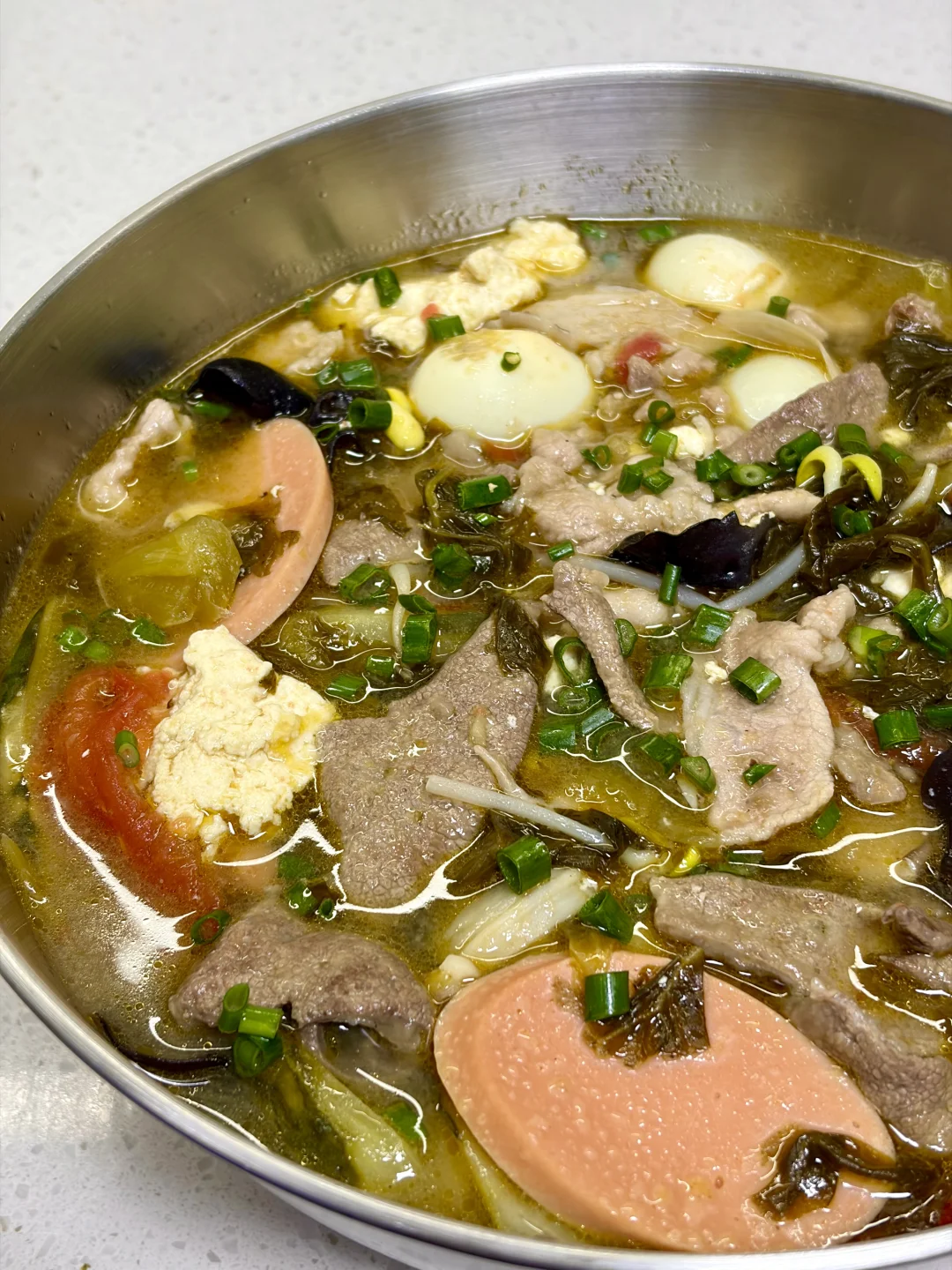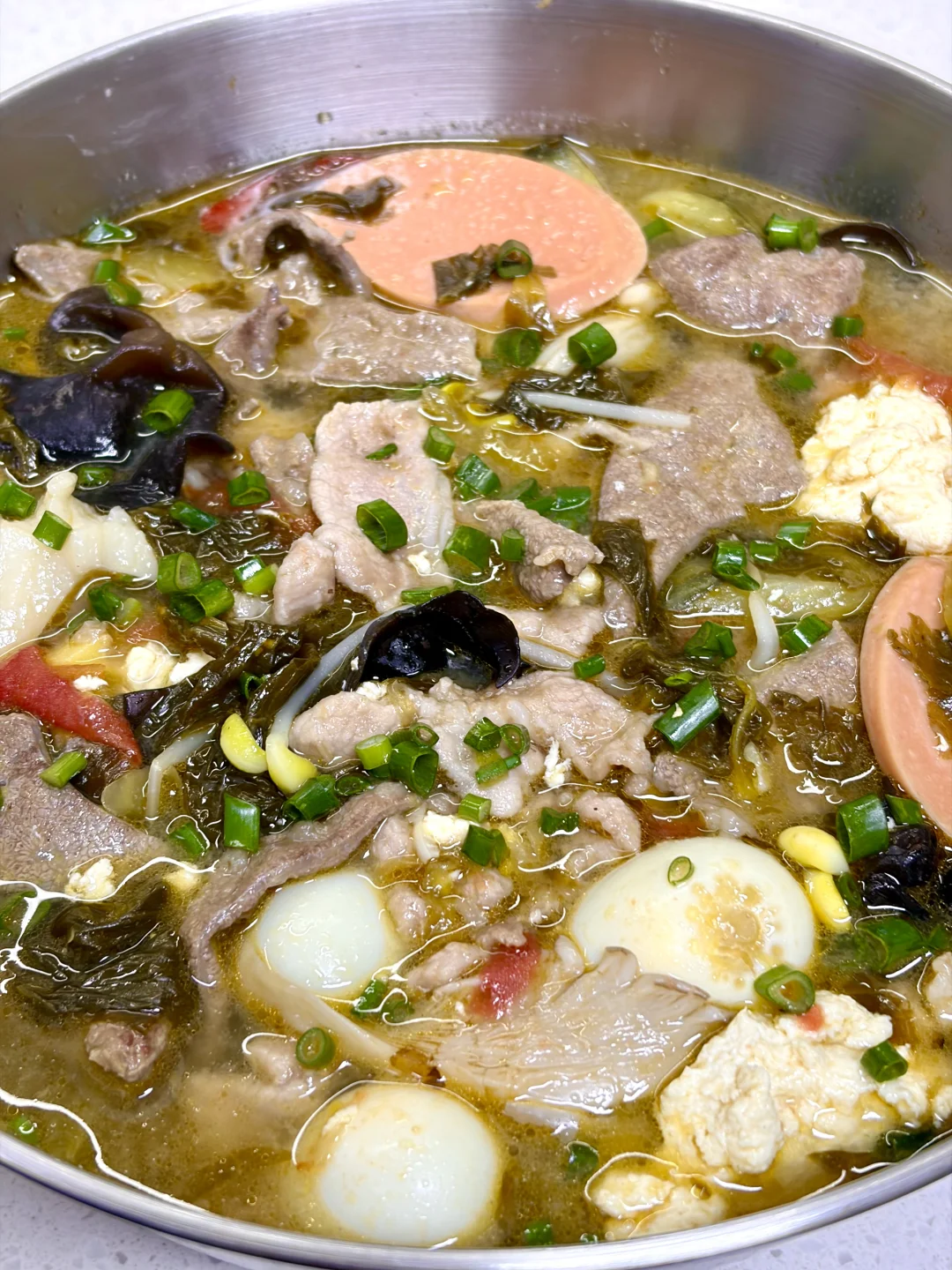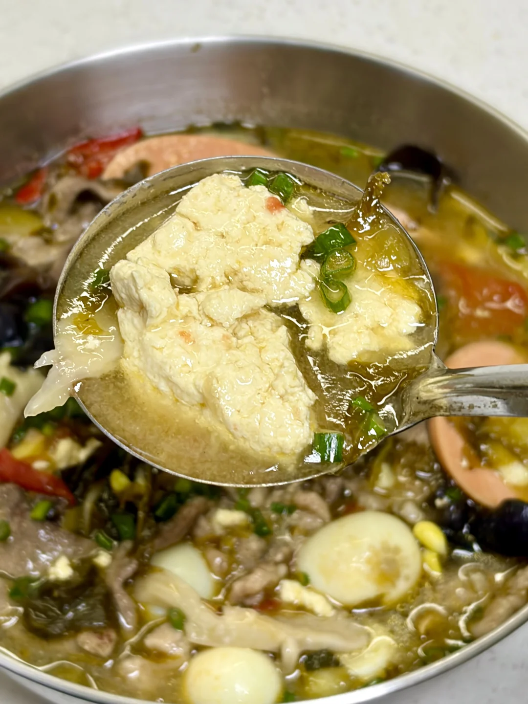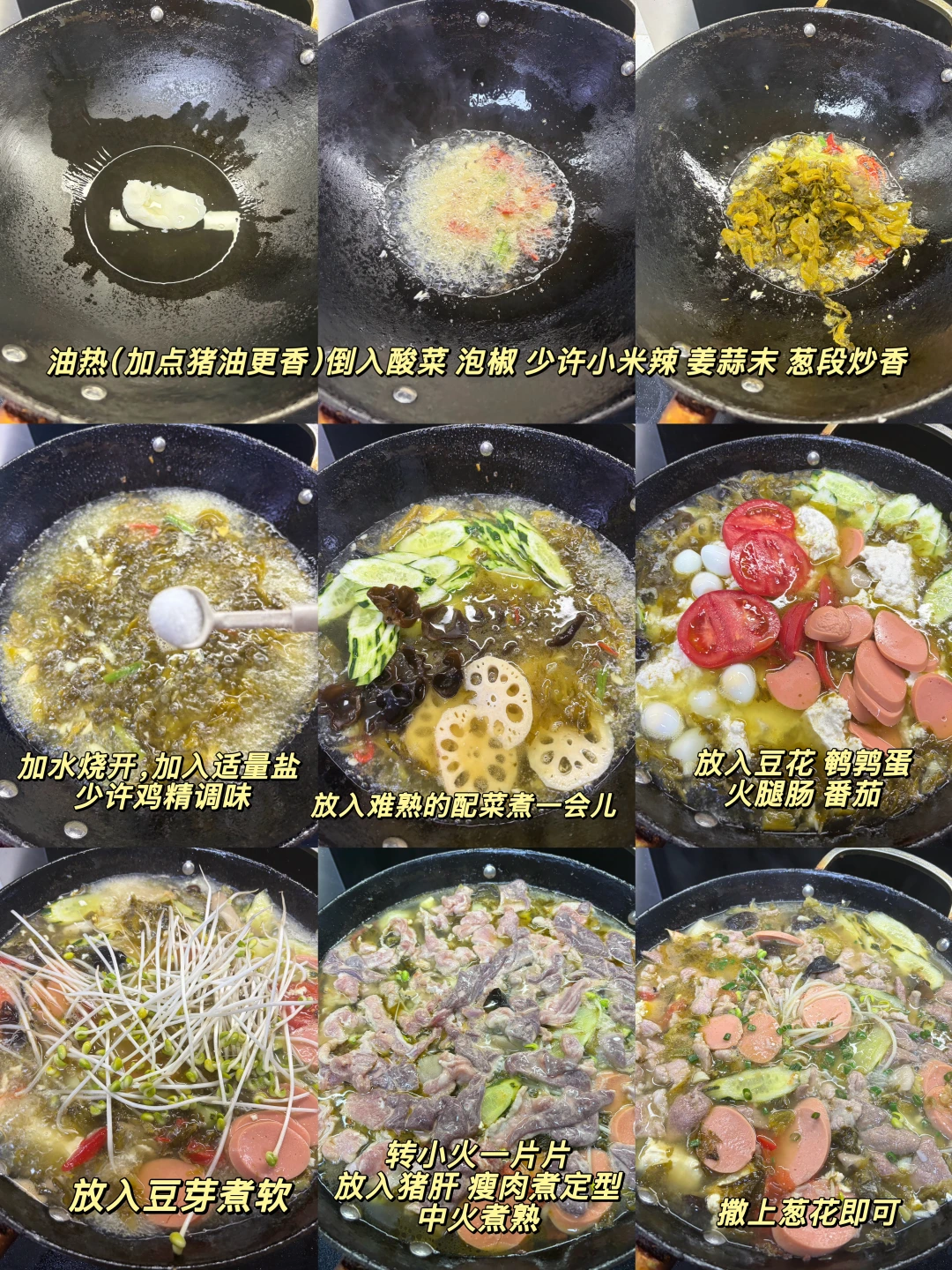 一锅又能喝汤又能吃菜的荤豆花也太过瘾了,全家老少皆宜,爱吃辣的可以打个蘸水,别有一番风味 1⃣️:锅中加入油(来点猪油更香),油热倒入酸菜 泡椒 少许小米辣 姜蒜末 葱段炒香 2⃣️:加入一大碗水烧开,加入适量盐 少许鸡精调味,放入莲藕 黄瓜等难熟的素菜煮熟,再放入鹌鹑蛋 火腿肠 番茄 豆芽煮软 3⃣️:转小火一片片放入瘦肉和猪肝煮定型,转中火煮熟,再撒点葱花即可