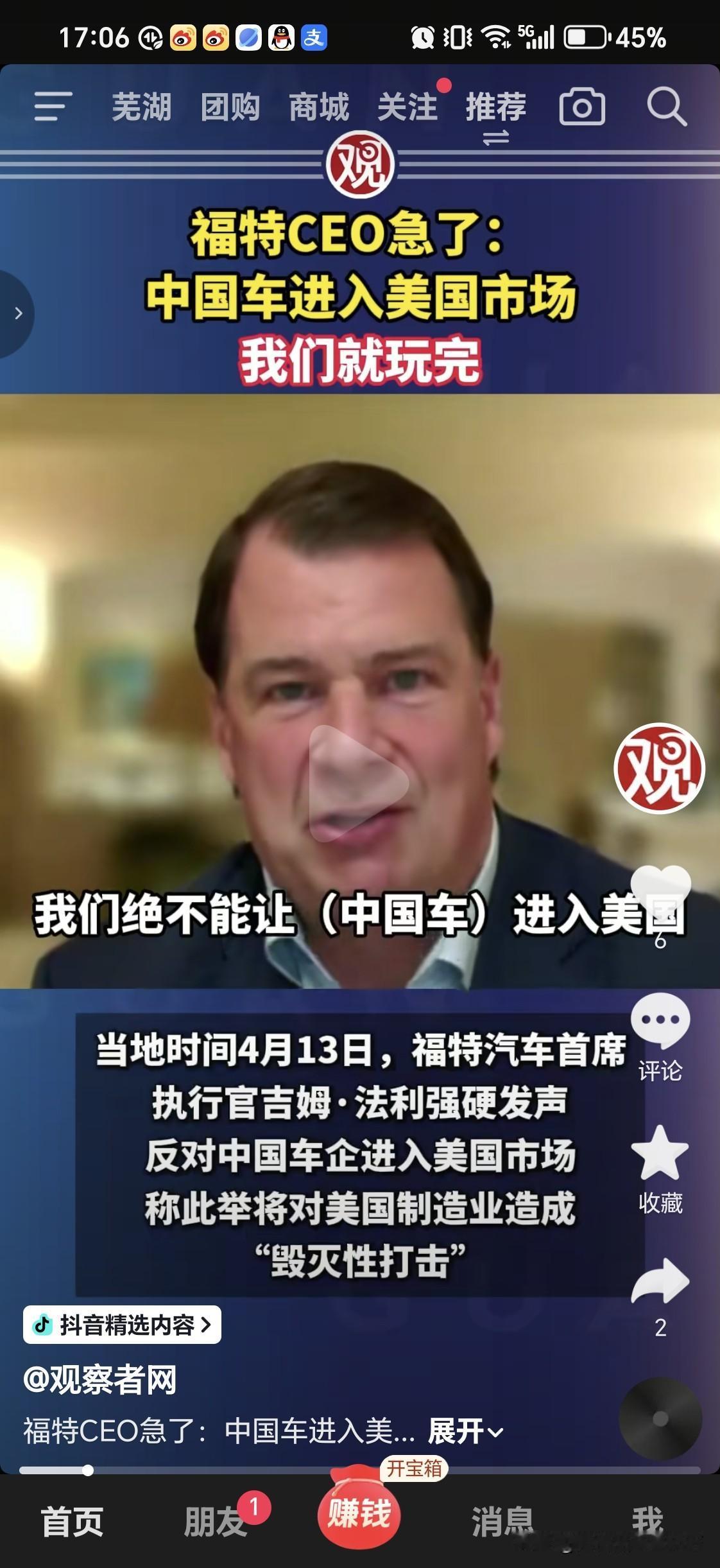 福特CEO的荒谬言论 福特汽车在行业内有造车专家的称谓,这家企业居然在社交媒体上公开组织中国国产汽车进入美国,这有一点公平竞争的精神吗? 要知道,福特汽车在中国是可以建厂和正常销售的? 而日本韩国汽车进入了美国对美国的通用和福特克莱斯勒这些汽车公司一样,产生了市场竞争和压缩,你们为什么允许日韩汽车进入美国而阻止中国汽车呢? 合资合作一起生产不行吗?