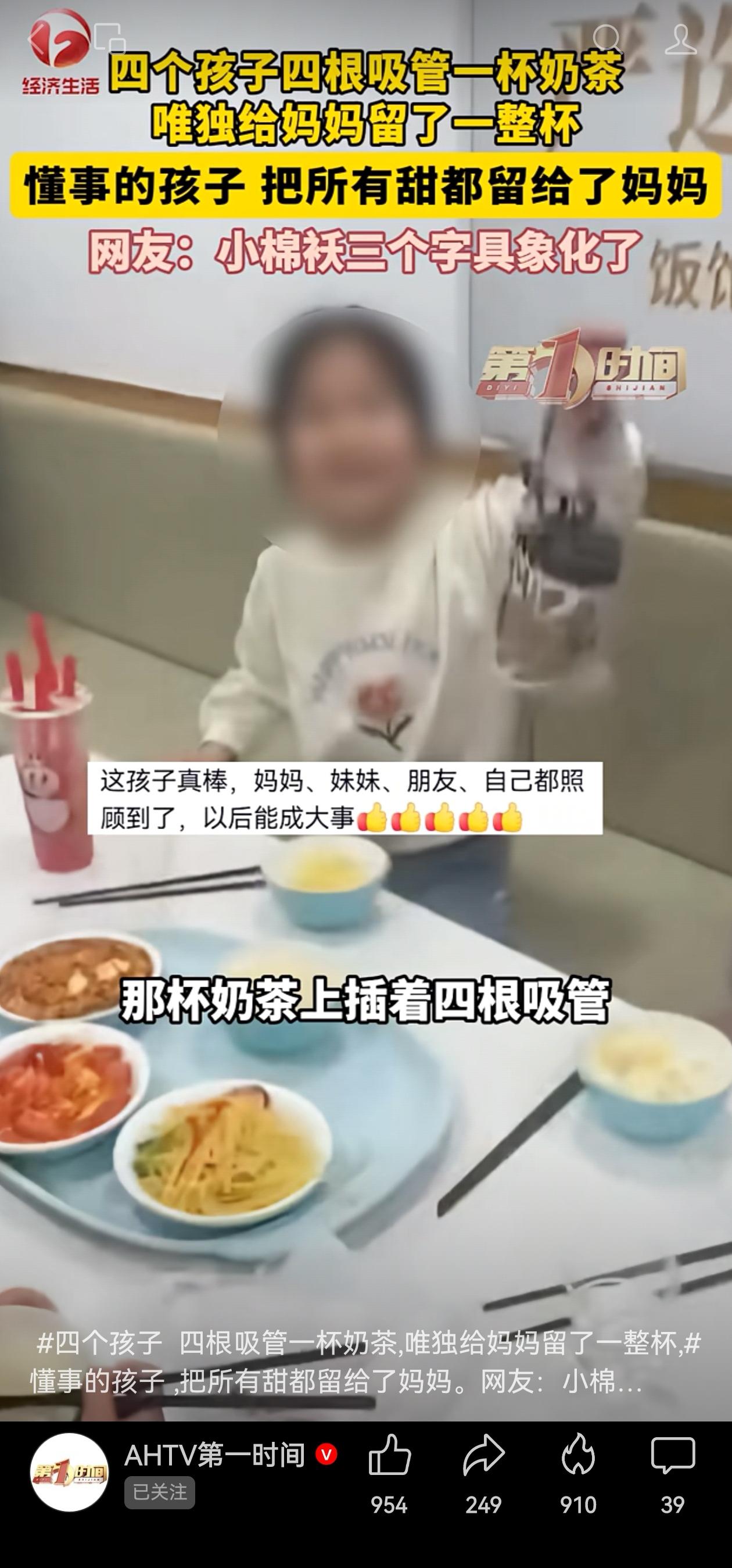 能干大事的小姐姐!近日,浙江的一个妈妈周末需要加班,愁两个孩子怎么办?最后给了姐姐50块钱,让姐姐带着妹妹出去吃饭。 这个姐姐怎么做的?她约上了两个小伙伴,四个孩子一起,开始“操盘”这50块钱:点几份素菜,够吃就行;奶茶只点一杯,插四根吸管,大家分着喝。 这操作太老练了!既控制了预算,吃饱了饭,又让每个小伙伴都尝到了甜头,合理分配了资源,大家有商有量,人人都开心! 但最窝心的是下一步:在预算有限的情况下,还专门给妈妈买了一杯完整的、只有一根吸管的奶茶留着! 她知道妈妈加班辛苦,必须单独留一杯完整的、没人碰过的奶茶。每一分钱真是花在了刀刃上:既没超支,又把心意送到了妈妈心坎里。 这种把最重要的人放在最后、把最好的留给最辛苦的人的做法,多少成年人都不一定有的格局吧? 小姐姐手握50块钱,把一顿简餐变成了一场有爱、有计划、有温度的“小项目”。饭吃了,朋友陪了,妹妹带好了,妈妈也感动了。50块钱花出了500块的效果,关键是花出了一个人的担当和情义。 给妈妈的爱一点没打折,这样的小姐姐,妈妈说是小棉袄,其实说是件军大衣都够格! 能干大事的小姐姐,行! 信息来源:AHTV第一时间