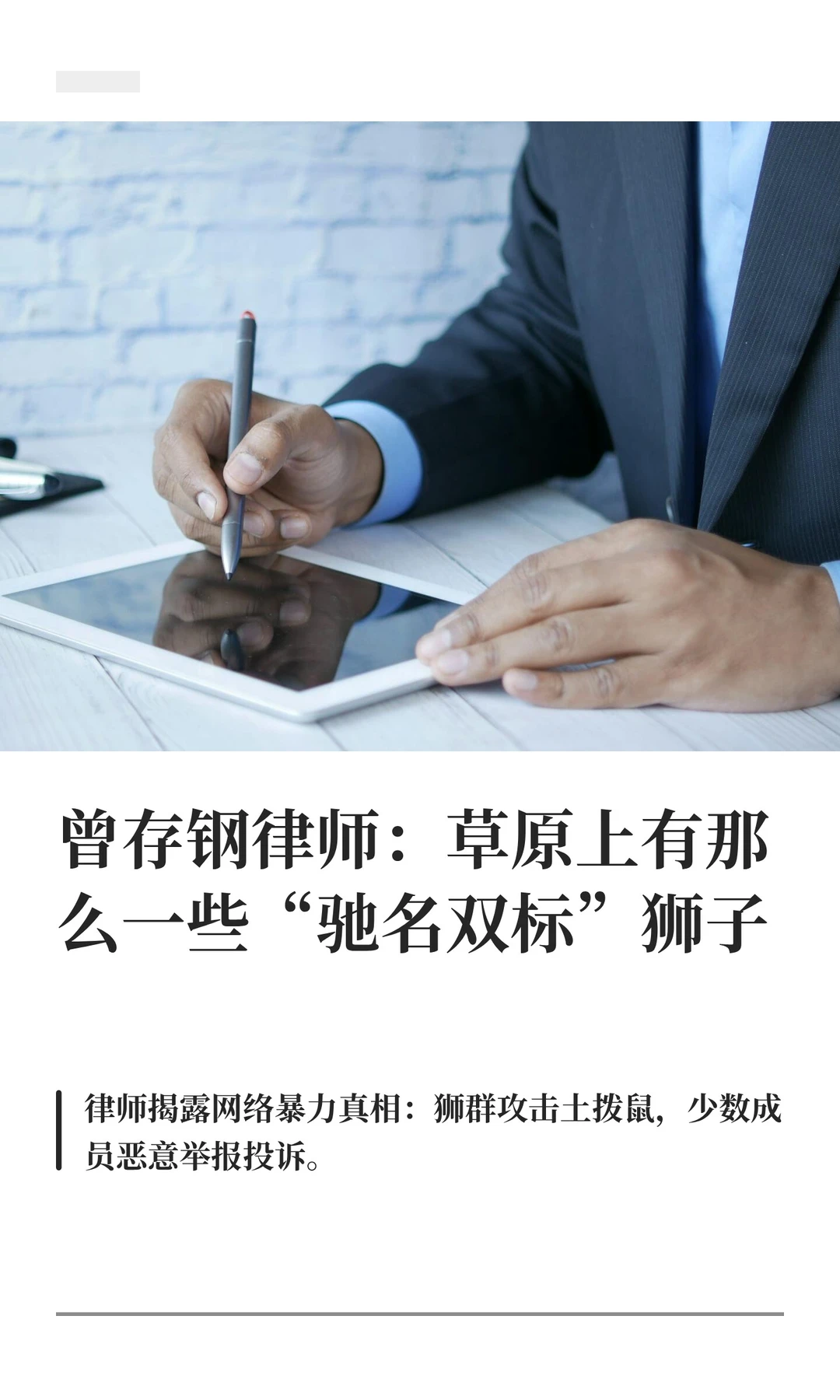 曾存钢律师指出,某些法律事件的评论者在热点事件中表现出“双标”行为,对正当评论进行恶意网暴,甚至通过各种途径升级投诉和举报,试图掩盖自身不当言论。这种行为反映了部分人的极端情绪和不理性反应。