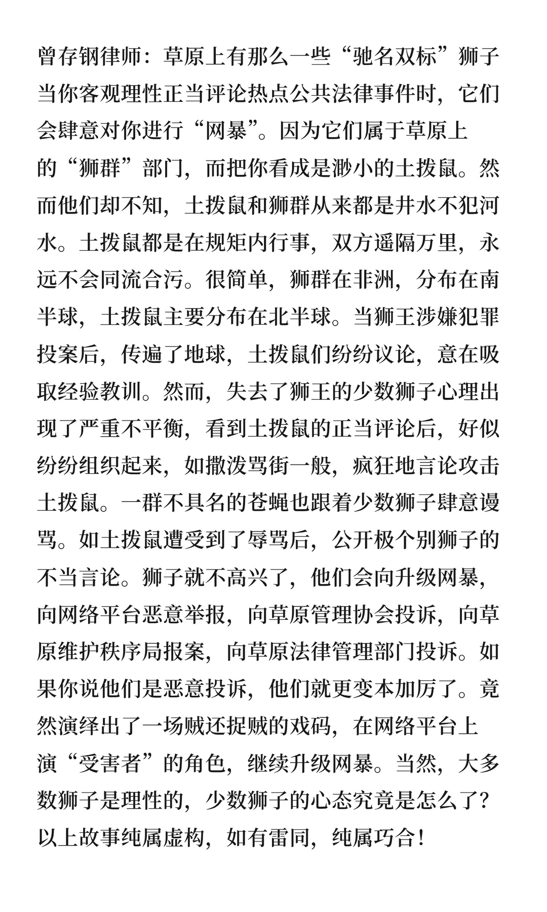 曾存钢律师:将律师划分为土拨鼠和狮子不可