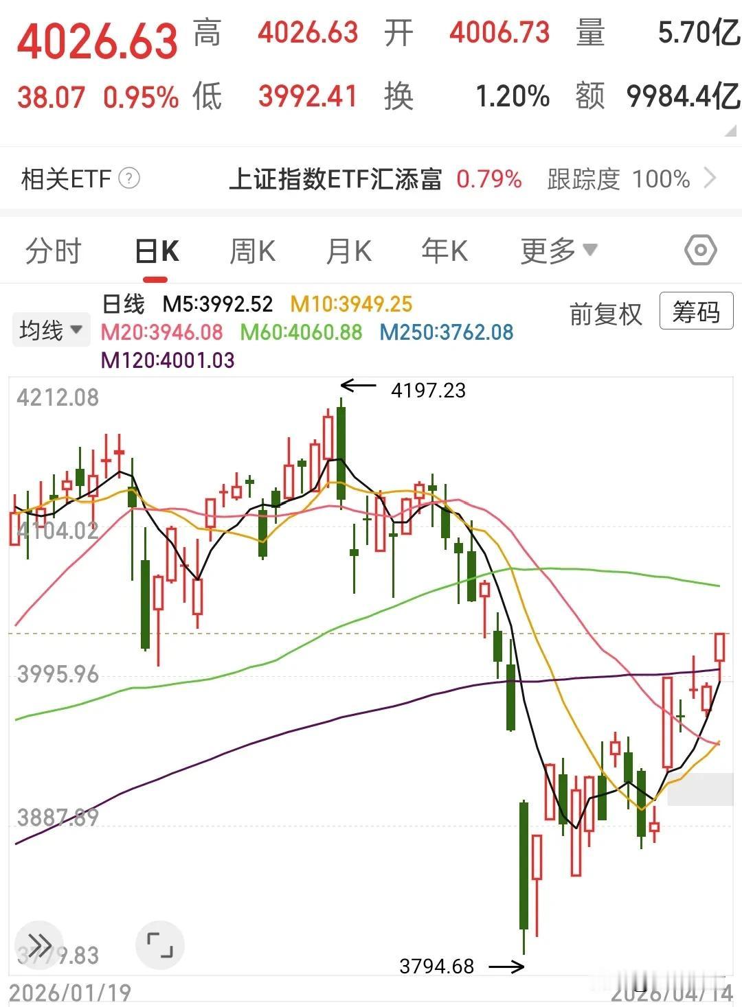 没想到这么快就回到了4000之上,还不到一个月,前些日子多少人都说牛市结束了,指数跌破3800的那天多少人恐慌了?都知道要在别人恐慌的时候贪婪,实际上当别人恐慌的时候自己比别人更恐慌……今天指数站上了4000点,很多个股还没回来,现在最怕的就是指数一开始回调,手里个股再次新低,牛市还没有结束,部分个股的行情似乎已经提前结束,千股千顶就是这次牛市的终极杀招!