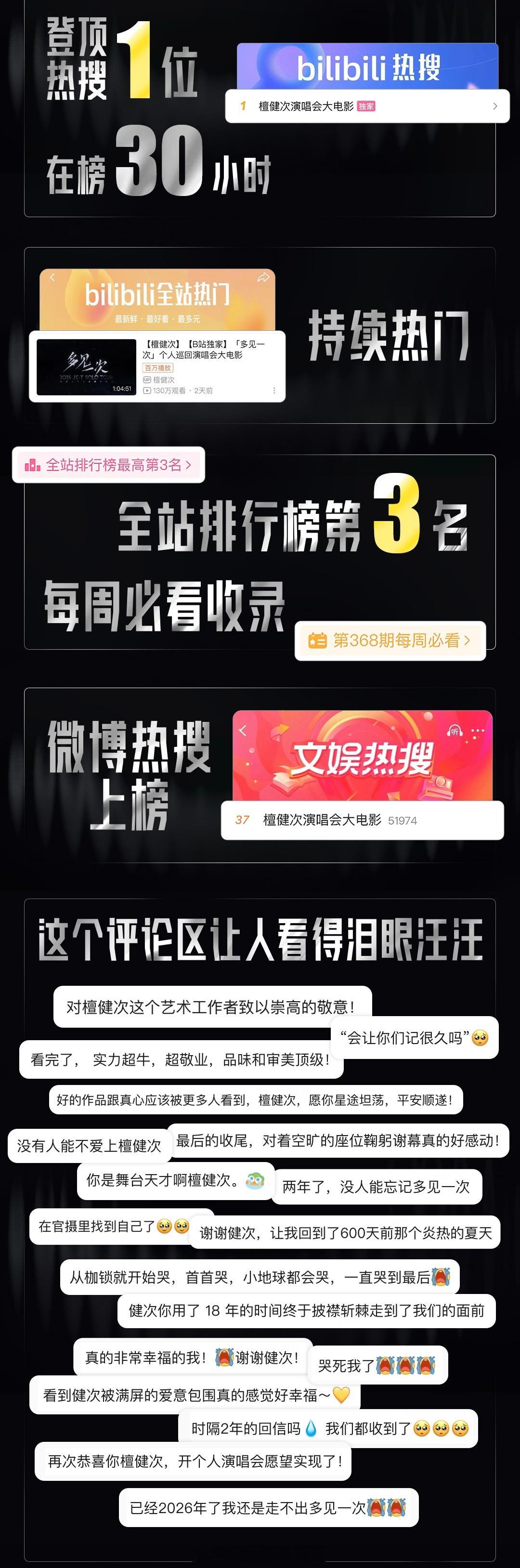 檀健次《多见一次》演唱会大电影B站官方战报互动值飙升,弹幕突破13w+热门持续在榜,最高2w+人在线观看热搜TOP1登顶,全站排行TOP3每周必看收录,檀健次牛逼🎉檀健次檀健次