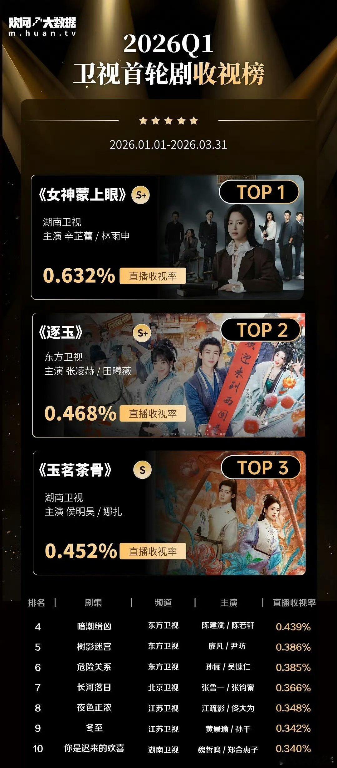 2026年Q1卫视首轮剧收视榜2026年第一季度卫视首轮剧收视榜2026年第一季度卫视首轮剧收视榜单出炉,涵盖《女神蒙上眼》《逐玉》《玉茗茶骨》《暗潮缉凶》《树影迷宫》《危险关系》《长河落日》《夜色正浓》《冬至》《你是迟来的欢喜》等多部作品,快来看看有没有你追过的剧。