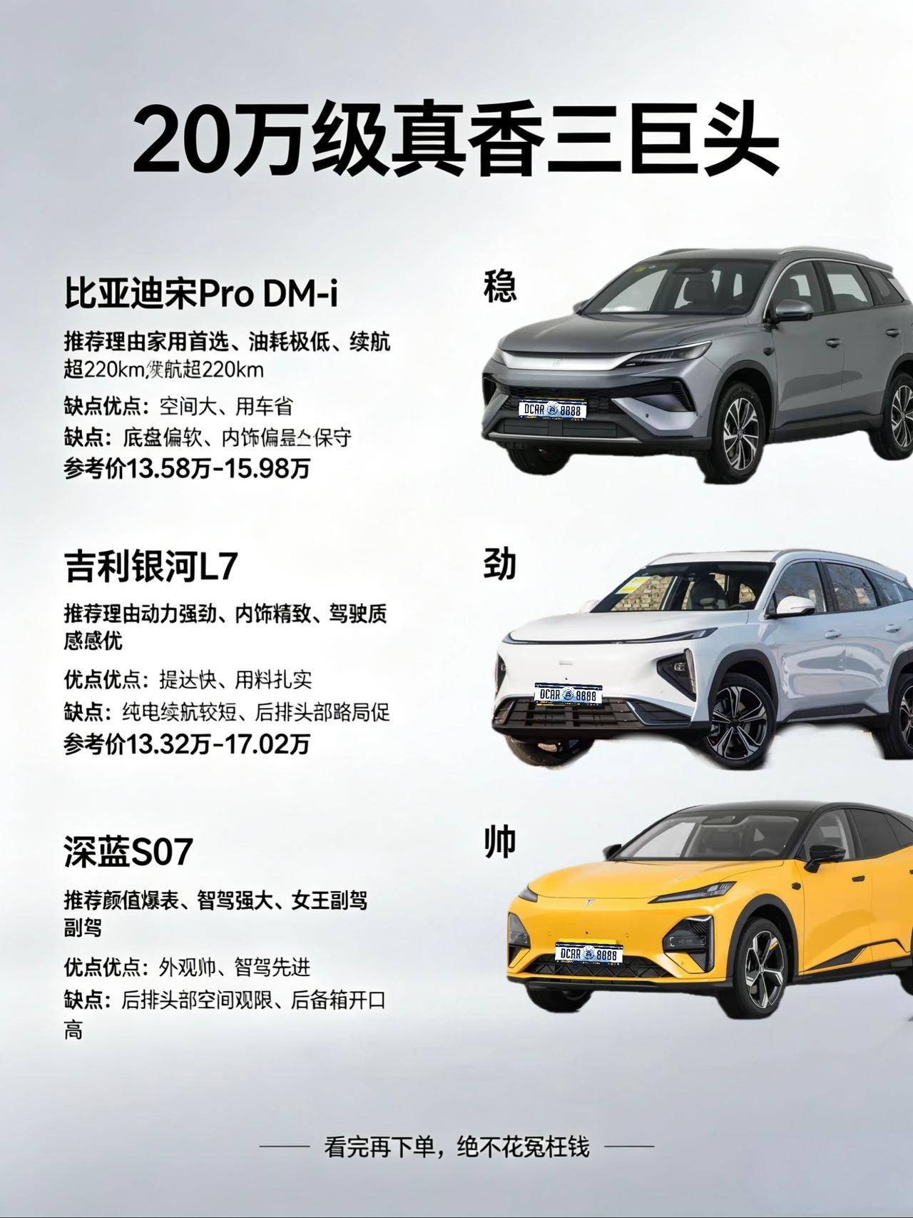 20万内别乱买!这三款新能源SUV才是2026年的“真香”之选 家人们,2026年的车市真的太卷了!手握20万预算想买SUV,面对一堆“电比油低”的新车,是不是感觉选择困难症都犯了?别慌,我最近刚帮朋友参谋完,这三台车——比亚迪宋Pro DM-i、吉利银河L7、深蓝S07,可以说是目前这个价位最值得看的“三巨头”。它们性格完全不同,看完你就知道该冲哪台。 1. 比亚迪宋Pro DM-i:闭眼入的“六边形战士” 如果你买车就是为了过日子,不想折腾,那宋Pro DM-i绝对是首选。2026款把纯电续航干到了220km,日常通勤基本可以当纯电车用,亏电油耗也就4个多油,加满油能跑一千五六百公里,这用车成本简直低到没朋友。 真实感受:这车开起来就是“白开水”,没啥激情但绝对顺滑。空间大、座椅舒服,带娃出门或者全家自驾,后备箱能装,后排也不挤。不过,它的底盘偏软,过弯支撑性一般,内饰设计也比较“大众脸”,追求个性的年轻人可能会觉得有点无聊。 适合谁:首购家庭、务实派。要的就是省油、省心、空间大,对驾驶乐趣没要求。 2. 吉利银河L7:要动力又要精致的“全能选手” 如果你觉得宋Pro太“佛系”,想要点驾驶质感,银河L7绝对是匹黑马。坐进车里,那个内饰用料和科技感(特别是高配的副驾屏和AR-HUD),明显比宋Pro更精致、更舍得下本。 真实感受:雷神电混系统真不是盖的,提速比DM-i猛,底盘调校也更扎实,开起来有种“欧系车”的紧致感,高速不飘。但代价是,它的纯电续航相对短一点(115km左右),如果你充电不方便,纯电体验不如宋Pro。另外,后排头部空间因为造型原因,比宋Pro略局促一点。 适合谁:年轻小家庭。既想要家用空间,又对动力和内饰质感有要求,偶尔想撒个欢。 3. 深蓝S07:颜值即正义的“科技潮男” (注:2026年在售主力为深蓝S07,老款S7已逐步退市)这车第一眼就能抓住你,无框车门、溜背造型,开出去回头率绝对碾压前两位。2026款升级了华为乾崑ADS SE智驾和FSD可变悬架,科技感和底盘质感比老款强太多了。 真实感受:增程版开起来无限接近纯电车,安静、顺滑。副驾那个“女王座驾”和娱乐屏,对副驾的照顾很到位。但帅是有代价的:溜背造型严重压缩了后排头部空间,高个子坐后排可能会顶头;后备箱开口高,装大件不如前两台方便。另外,增程器在急加速或亏电时,声音还是会传进来一点。 适合谁:单身贵族、年轻情侣。对空间实用性要求不高,但对颜值、智驾和个性有执念的用户。 抄作业时间 * 求稳过日子:直接冲比亚迪宋Pro DM-i,销量王不是吹的,买了绝对不会错。 * 要质感要动力:选吉利银河L7,它是在家用和驾驶乐趣之间平衡得最好的。 * 为颜值买单:选深蓝S07,但一定要去试坐后排,能接受空间再下单。 最后提醒一句,20万不是小钱,一定要去4S店亲自开一圈!感受下底盘滤震,试试车机卡不卡,你的身体会告诉你最终答案。【来自懂车帝车友圈】
