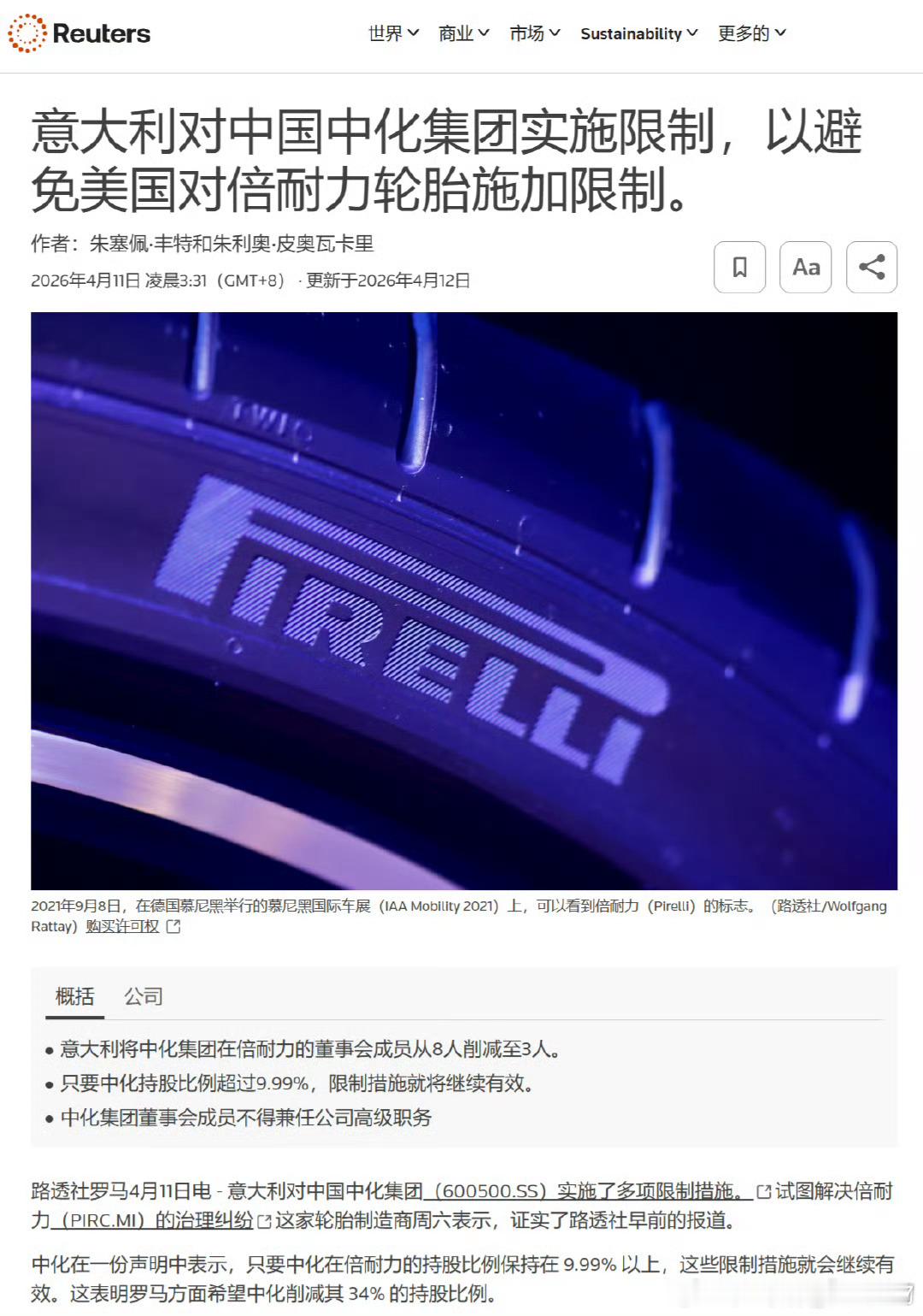 意大利政府发言人暂未就此置评,倍耐力发言人拒绝回应,中国企业方面也未立即发表评论。===路透社的文章,近日,意大利政府以国家安全为由,动用“黄金权力”规则,明确限制中国化工对早年收购的倍耐力公司行使大股东权利。中国化工集团是倍耐力最大的股东,而意大利商人马可·特隆凯蒂·普罗韦拉旗下的Camfin公司持有约26%的股份,并计划将其增持至29.9%。