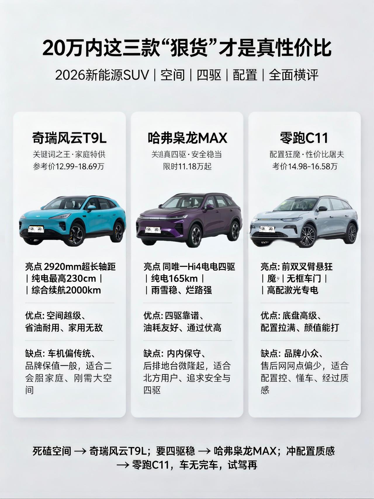 20万内别只盯着比亚迪!这三款“狠货”才是真性价比 家人们,2026年的车市真的卷到没边了!手握20万预算想买SUV,除了那几款“街车”,其实还有一堆被严重低估的“宝藏车型”。今天咱就唠三款同样能打,甚至在某些方面更极致的“狠角色”——奇瑞风云T9L、哈弗枭龙MAX、零跑C11。它们分别代表了“大空间”、“真四驱”和“高配置”,看看哪款才是你的菜。 1. 奇瑞风云T9L:空间越级的“家庭特供车” 如果你是一家老小出门,对空间有执念,那风云T9L绝对是这个价位的“降维打击”。这车刚在2026年4月13日上市,直接把中型SUV的价格打到了12万级,主打一个“量大管饱”。 * 参考价格:官方指导价12.99-18.69万,限时置换价12.59-18.29万,性价比炸裂。 * 核心亮点:2920mm的轴距!这数据比很多B级车都夸张,二排腿部空间超1米,真正做到了“葛优躺”自由。加上它用的是鲲鹏超混C-DM系统,纯电续航有135km和230km(CLTC)两个版本,综合续航能跑到2000km,长途自驾完全没焦虑。 * 真实槽点:车机智能化体验(如语音场景理解)比起头部新势力还是稍微“传统”一点;品牌在新能源领域的号召力不如比亚迪,保值率可能稍弱。 * 适合谁:二胎/三胎家庭、经常满载出行的务实派。要的就是花小钱办大事,空间是刚需。 2. 哈弗枭龙MAX:同级唯一的“全能四驱战士” 在20万内想买带真四驱的新能源SUV?枭龙MAX几乎是唯一的选择。虽然2026年它已经不是最新款,但二代Hi4电四驱技术经过市场验证,可靠性没得说,特别适合北方的朋友。 * 参考价格:官方指导价13.18万起,4月限时换新价低至11.18万起,落地仅需12万出头,性价比极高。 * 核心亮点:全系标配Hi4电四驱。雨雪天、泥泞路,四驱的稳定性和脱困能力是两驱车给不了的。CLTC纯电续航165km,日常代步够用,亏电油耗也就5-6个油,对于一台四驱车来说相当省了。 * 真实槽点:内饰设计相对保守,科技感不如新势力;后排地台中间有轻微隆起(为了四驱结构),不是纯平;高速风噪控制一般。 * 适合谁:北方用户、轻度越野爱好者、对通过性有刚需的家庭。如果你那冬天路滑,或者周末喜欢去郊外撒野,它比两驱车靠谱得多。 3. 零跑C11:堆料狂魔的“价格屠夫” 如果你追求无框车门、前双叉臂悬架、激光雷达这些通常只在30万级豪车上才有的配置,那零跑C11 2026款绝对是“花小钱装大X”的典范。2026款在智驾和续航上又有升级,性价比依旧能打。 * 参考价格:2026款增程/纯电指导价14.98-16.58万,终端优惠后约14.38-15.98万,20万内能落地中高配。 * 核心亮点:底盘用料越级(前双叉臂+后五连杆),开起来底盘质感高级,操控性好。配置拉满,无框车门、三联屏、Nappa真皮座椅(高配)都给到你。纯电版续航640km,增程版纯电续航300km,市区通勤基本不用油。 * 真实槽点:品牌知名度相对较弱,售后网点不如大厂密集;增程版发动机介入时声音相对明显;品控细节(如异响)需要挑一下车。 * 适合谁:年轻用户、配置控、对驾驶质感有要求的“懂车帝”。愿意用品牌溢价换取更高硬件规格的用户。 抄作业时间 * 纯家用,死磕空间:闭眼冲奇瑞风云T9L,同价位空间无敌手。 * 要安全,图四驱:直接上哈弗枭龙MAX,雨雪天气和烂路心里不慌。 * 要享受,玩性价比:选零跑C11,用紧凑级的钱买中级的享受,但得接受品牌小众。 最后提醒一句,车无完车,一定要去试驾!风云T9L试试第三排,枭龙MAX试试四驱脱困,C11试试底盘滤震。你的屁股和你的钱包,最终会告诉你正确答案。【来自懂车帝车友圈】
