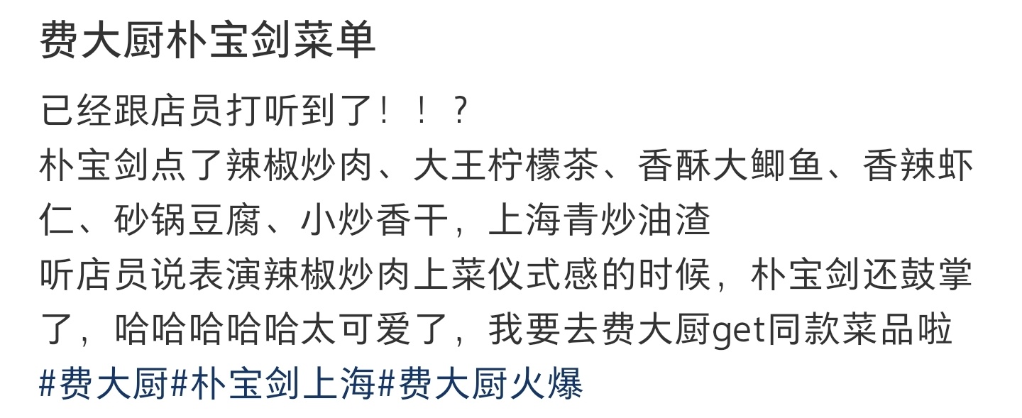 朴宝剑 费大厨 这波免费宣传也是又给费大厨赚到了!!!连菜单都被打听到了啊啊啊!接下来一个月这几道得卖爆了吧!