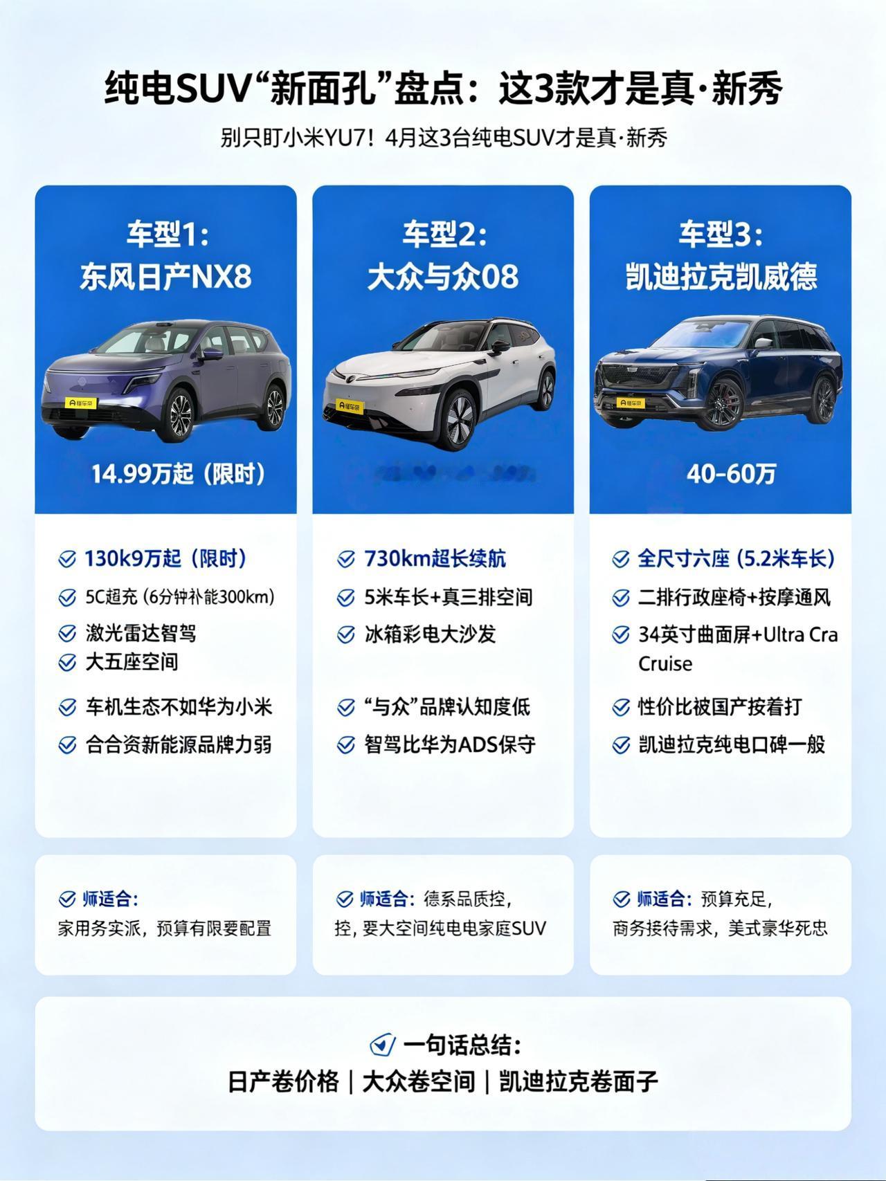 纯电SUV“新面孔”盘点:这3款才是真·新秀 兄弟们,2026年4月的车市简直比天气还热!如果你以为只有小米YU7在刷屏,那就亏大了。这个月其实扎堆来了好几款全新平台、全新设计的纯电SUV“新面孔”,从20万级家用卷王到40万级豪华旗舰都有。今天咱就专门唠唠这几款真正意义上的“新进入者”,看看谁才是你的菜。 一、合资反击战:东风日产NX8(纯电版) (4月8日刚上市,合资品牌的“技术觉醒”) - 新在哪?这是天演架构2.0的首款旗舰,不是油改电,而是正经的800V碳化硅平台。作为日产在2026年的“翻身之作”,它带着5C超充电池(6分钟补能300km)和激光雷达智驾杀入20万级市场,摆明了要跟国产新势力抢饭吃。 - 值不值得看? - 优点:18-25万的预售价很有杀伤力;纯电版续航580km/650km(CLTC),补能速度在合资车里是“天花板”级别;空间利用率高,典型的“大五座”家用车。 - 槽点:品牌号召力在新能源领域不如国产;车机系统(NISSAN OS 2.0)虽然升级了,但跟华为、小米比生态联动还是弱。 - 适合谁:合资品牌铁粉、对补能速度有要求、想要激光雷达但预算有限的家庭用户。 二、大众的“中国芯”:大众与众08 (4月16日上市,大众安徽首款全尺寸纯电SUV) - 新在哪?这是大众“在中国,为中国”战略下的全新产物,基于本土开发的800V架构,不是ID.系列的“拉皮车”。5米级车长、730km续航,预售价23.99-29.99万,直接对标理想L7和问界M7。 - 值不值得看? - 优点:全尺寸大空间,第三排不再是“小板凳”;本土化设计更懂中国用户(冰箱、彩电、大沙发配齐);超级快充5分钟补能150km。 - 槽点:品牌新,“与众”这个子品牌知名度低,保值率是未知数;智驾系统(增强版L2)相比华为ADS略显保守。 - 适合谁:德系品质控、想要大空间纯电SUV但不想买新势力的保守派家庭。 三、美式豪华新秀:凯迪拉克凯威德 (4月22日上市,全尺寸纯电旗舰) - 新在哪?这是凯迪拉克在IQ锐歌之后的全新全尺寸六座旗舰,车身超5.2米,轴距超3米,定位“公路旗舰”。它填补了凯迪拉克在40-60万级纯电SUV市场的空白,直接叫板蔚来ES9和宝马iX。 - 值不值得看? - 优点:美式豪华气场拉满,第二排独立行政座椅带按摩通风;Ultra Cruise智驾系统和34英寸曲面屏是亮点;续航预计超600km(EPA)。 - 槽点:价格贵(预计40-60万),性价比被国产车按着打;凯迪拉克在纯电领域的口碑积累不足(参考锐歌的销量惨状)。 - 适合谁:预算充足、商务接待需求强、对美式豪华有执念的用户。 四、总结:别光看热闹,要看门道 - 要性价比+快充 → 东风日产NX8(合资里的“技术流”,适合务实派)。 - 要德系大空间+本土化 → 大众与众08(大众的“中国特供”,适合家庭用户)。 - 要豪华气场+六座 → 凯迪拉克凯威德(面子工程,适合商务人士)。 最后的大实话:2026年4月的新车,核心都在“卷技术”(800V、5C超充)和“卷空间”(全尺寸、六座)。建议你重点关注日产NX8和大众与众08,这两款车价格实在,技术也跟上了国产步伐;凯威德嘛,除非你是凯迪拉克死忠粉,否则建议观望一下口碑。【来自懂车帝车友圈】