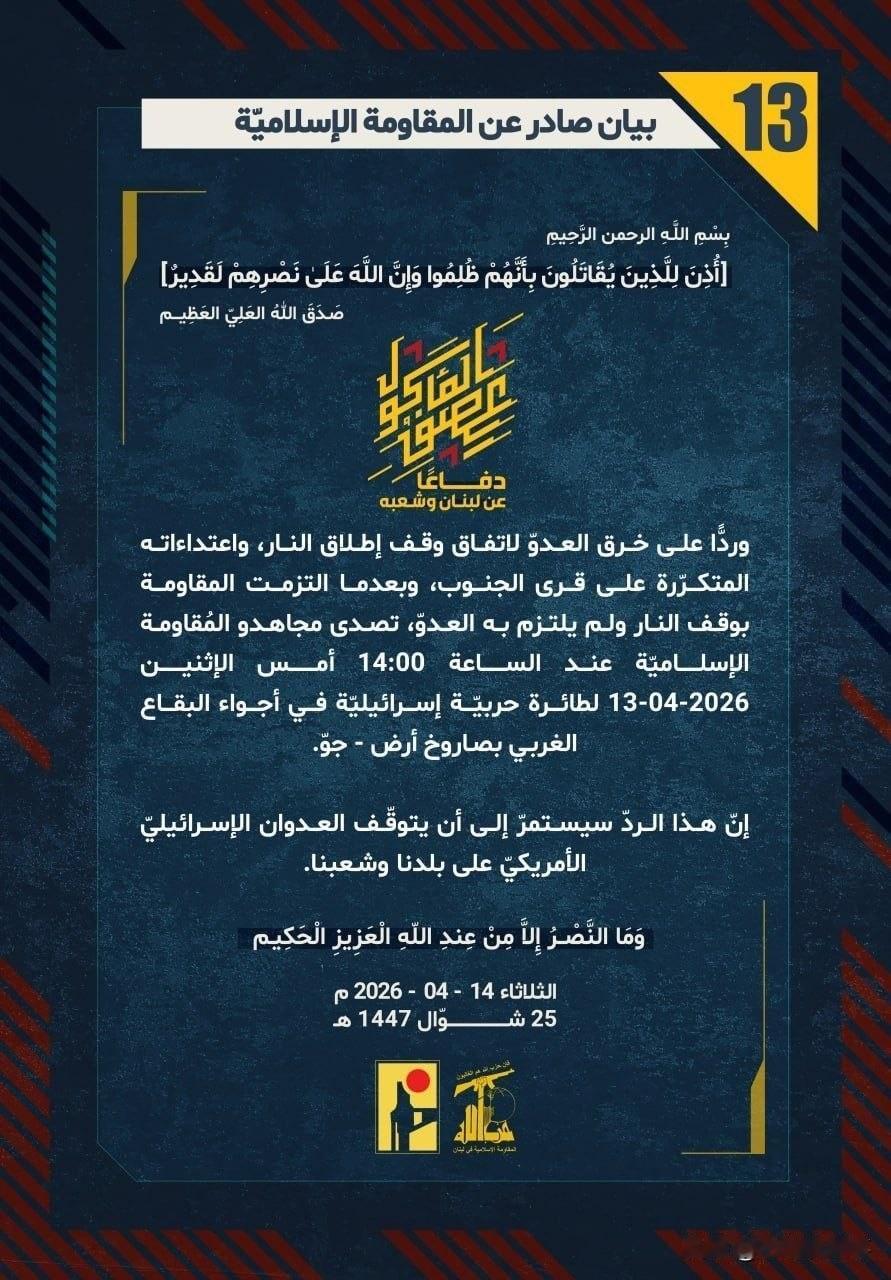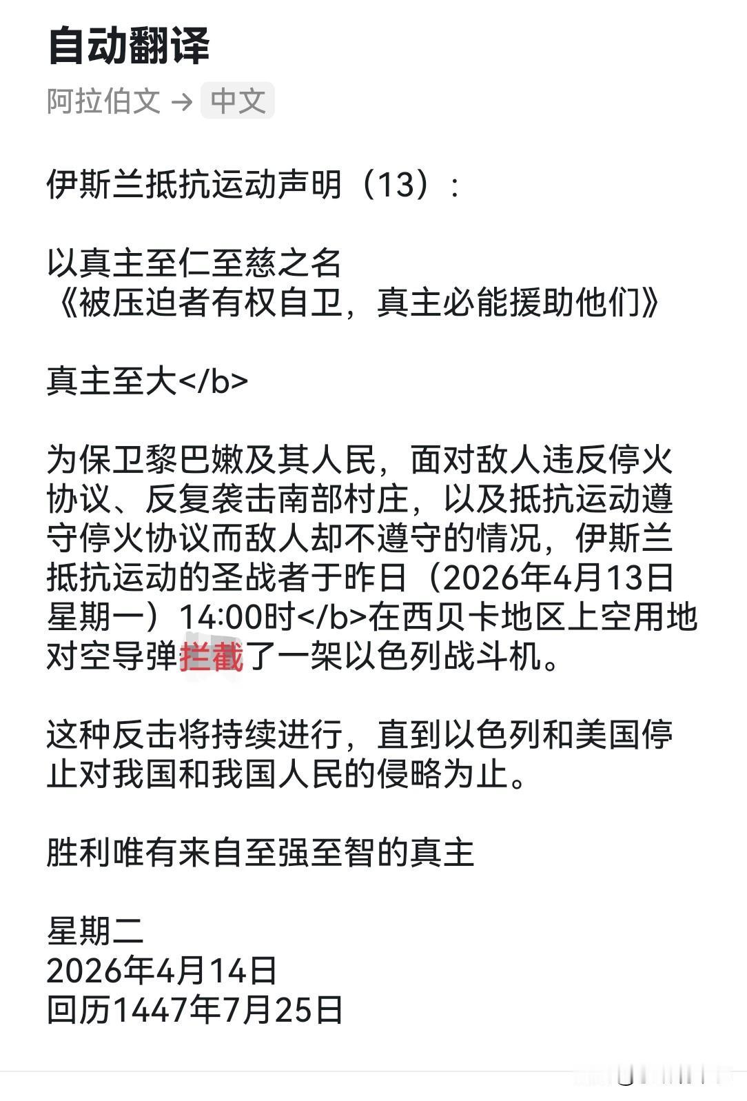 黎巴嫩真主党宣布,4月13日(昨天)下午14时,其武装人员在贝卡西部地区使用地对空导弹拦截了一架以色列战斗机(有信源称是F-16战斗机)。