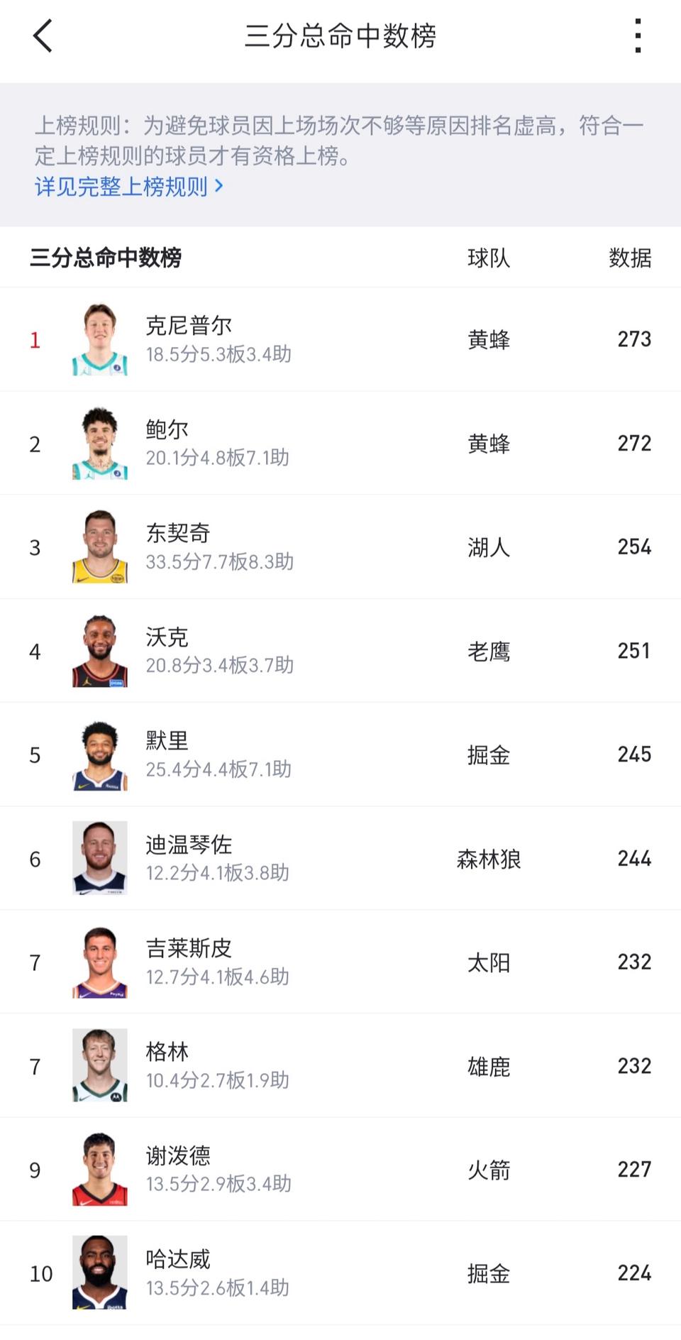 本赛季NBA三分球总命中数榜前十,黄蜂两名球员排在前二,东契奇第三,默里第五,库里无缘前十。 本赛季的三分王被黄蜂新秀克尼普尔拿下,NBA历史上从未有新秀拿到过三分王,哪怕库里和雷阿伦都没能拿到过。 克尼普尔本赛季命中了273记三分球,而队友鲍尔命中了272记三分球,但凡鲍尔在今天的比赛多投两记三分球,三分王就属于鲍尔的了。 湖人队的东契奇命中了254记三分球,排在三分榜第三名,值得一提的是,东契奇还是本赛季的得分王。 库里本赛季因为伤病困扰只打了43场比赛,因此三分球命中数并不多,库里本赛季命中190记,排在三分榜第27名,在此之前,库里已经拿到了8次三分王。