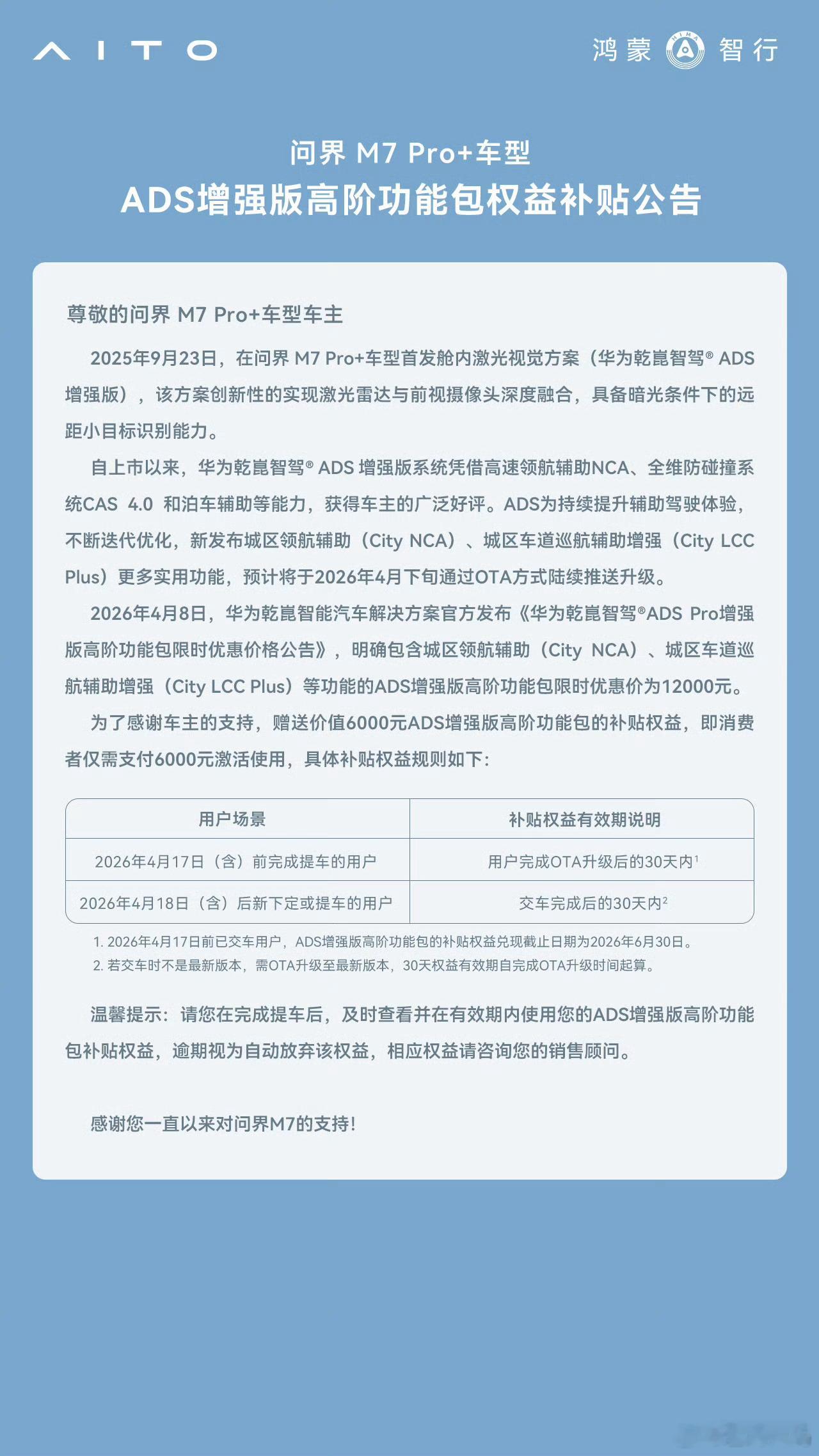 【问界 M7 Pro+版推出ADS增强版高阶功能包优惠活动】