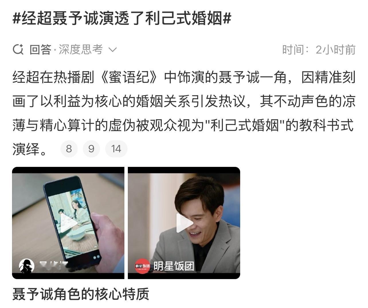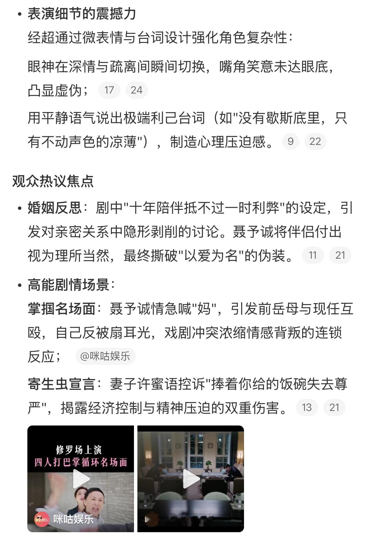 经超聂予诚演透了利己式婚姻以爱为名,行算计之实;温柔是面具,自私是底色。经超饰演聂予诚,把精致利己婚姻演到扎心现实:把伴侣牺牲当理所当然,把婚姻当稳赚交易,体面一戳就破。比争吵更寒心的,是只爱自己的婚姻。