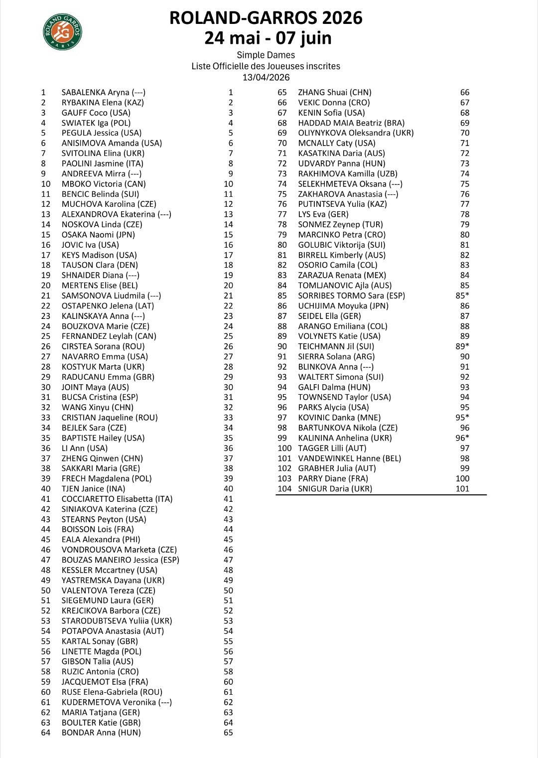法网2026公布单打正赛入围名单📜