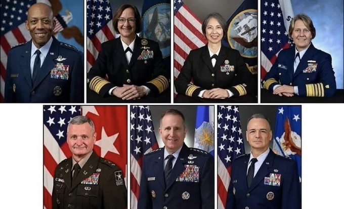 🔍 人物身份与背景1. **第一排(从左至右)** * **查尔斯·昆顿·布朗(Charles Q. Brown Jr.)**:空军上将,时任美军参谋长联席会议主席,也是美军历史上第二位担任该职位的非裔美国人。 * **莉萨·弗兰凯蒂(Lisa Franchetti)**:海军上将,时任美国海军作战部长,是美军历史上首位女性军种主官,也是首位进入参谋长联席会议的女性成员。 * **塞缪尔·帕帕罗(Samuel Paparo)**:海军上将,时任美国太平洋舰队司令。 * **琳达·费根(Linda Fagan)**:海岸警卫队上将,时任美国海岸警卫队司令,也是美军历史上首位女性四星上将。