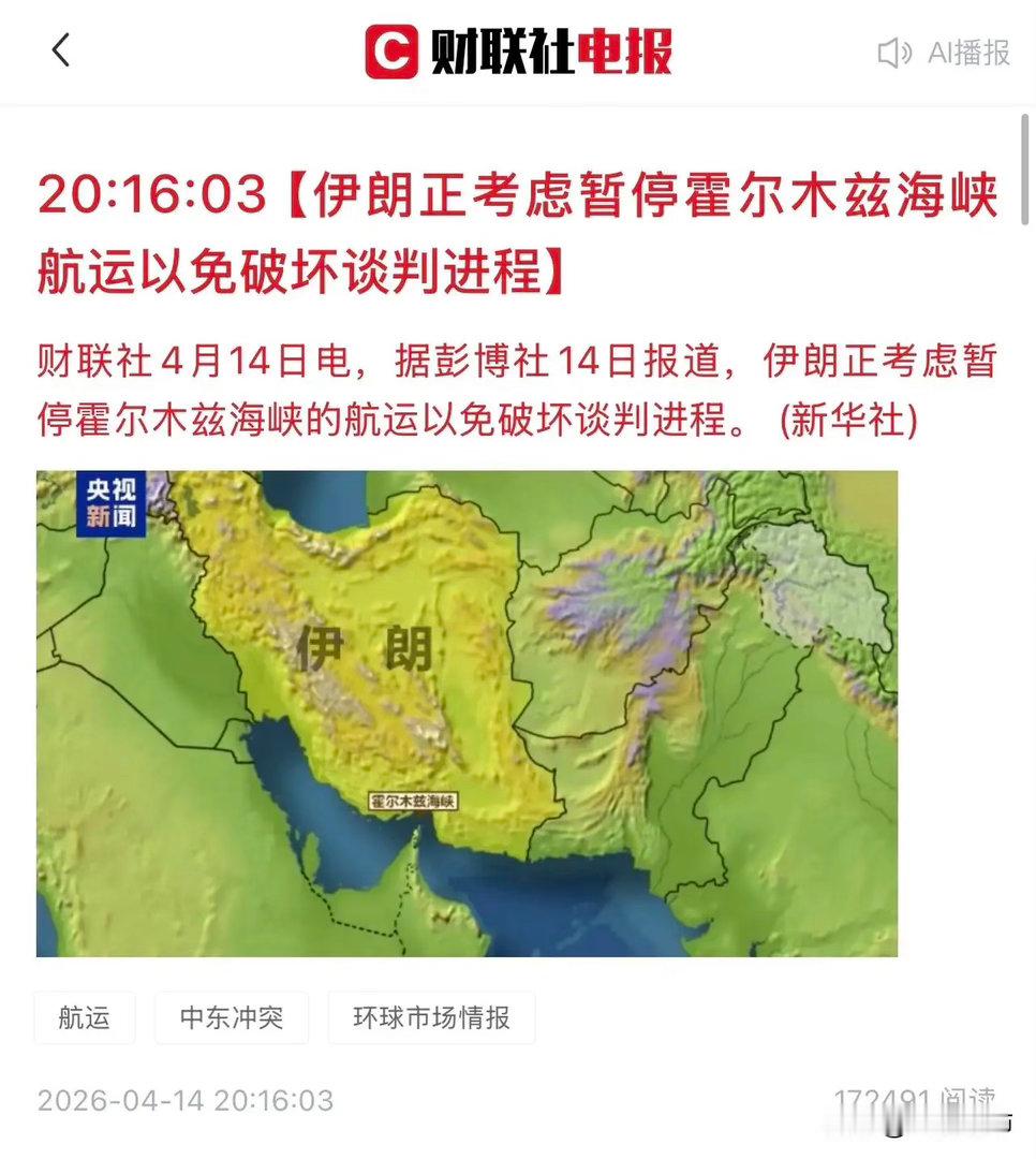 1、美伊局势好消息不断,伊朗正考虑暂停霍尔木兹海峡航运,以免破坏谈判进程;