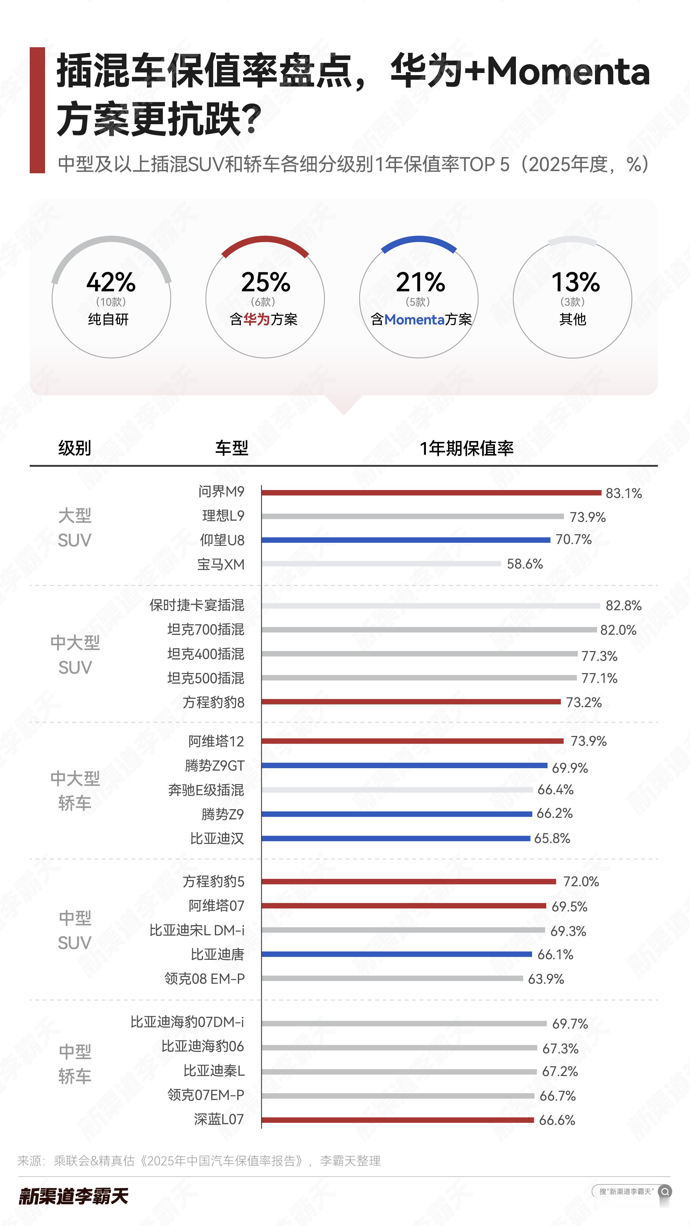 乘联会2025年度保值率报告显示,在中型及以上插电混动车型里,比亚迪占据半壁江山,这是车企品牌力的体现;而在技术品牌层面,华为+Momenta的智能辅助驾驶方案,同样拿下了近半份额。