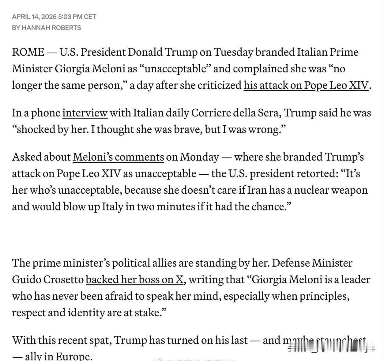 意大利总理梅洛尼日前批评特朗普攻击良十四世的言论“不可接受”。 特朗普周二接受意大利采访时直接反击,称“真正不可接受的是她”,还抱怨她“已经不是原来的那个人”。川普甚至指责梅洛尼对伊朗核问题态度软弱,声称“如果伊朗有机会,两分钟内就能把意大利炸掉”。 这起由“教皇言论”引发的口水战,本质上是美伊冲突背景下,意大利国内政治压力与特朗普“极限施压”外交风格的激烈碰撞。 作为特朗普在欧洲最亲密的盟友之一,梅洛尼的“背叛”表明,即使是欧洲右翼,在国家利益与“美国优先”冲突时,也会选择前者。 特朗普的施压风格是,当“友谊”失效时,他立刻转向公开羞辱和制造恐惧的“交易”模式。 在国内支持率下滑的背景下,梅洛尼需要通过展现“维护国家尊严”的形象来巩固地位,对抗特朗普反而能收获民意支持。 这场公开交锋意味着特朗普连自己与在欧洲最后、也可能是最坚定的盟友都开始出现裂痕。 总的来说,这不仅是两位领导人的个人恩怨,更是“美国优先”单边主义与欧洲务实多边主义的一次正面碰撞。