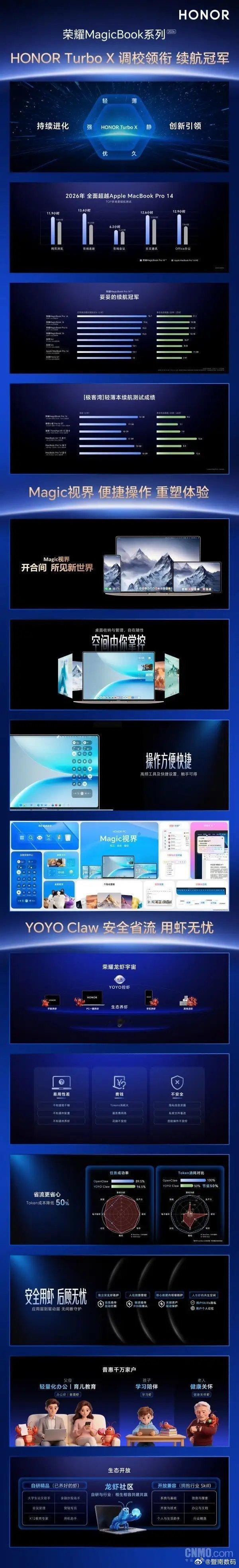 荣耀MagicBook系列搭载荣耀自研端侧“龙虾”AI智能体——YOYO Claw,开创全新“养虾本”品类,为用户破解“部署及上手复杂、使用成本高、隐私安全风险”三大难题:一、荣耀将深度优化的AI智能体深度预制到系统中,覆盖教育、办公、学术、内容创作、智能辅助五大场景,通过不断地自主进化,学习用户的使用习惯一起成长;二、简单、高频及涉及本地操作的任务全部在端侧完成,省去词元消耗。当需要调用云端算力时,通过优化上下文、记忆匹配等方式,最大化每一次云端调用的效率;
