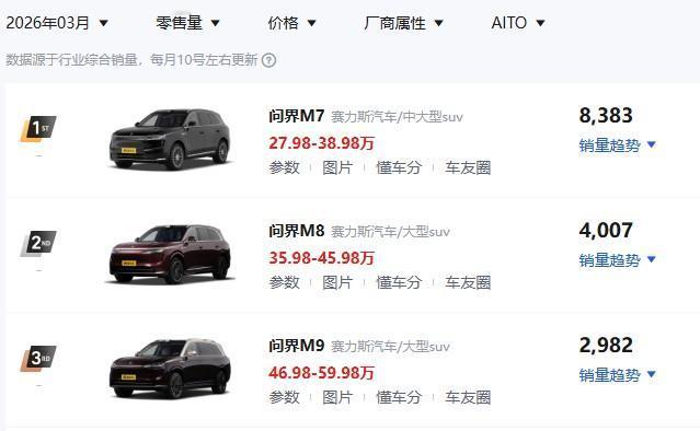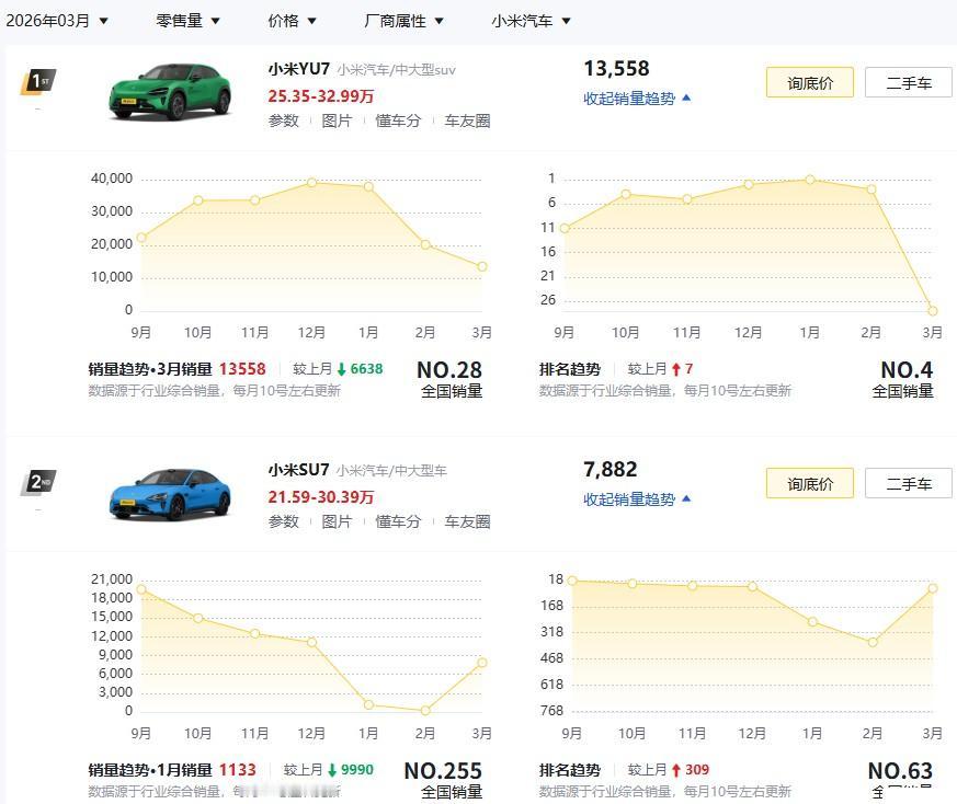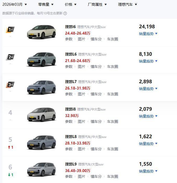 3月份的车型销量,一些新的特点: 大型车销量低迷,理想L7,L8,L9,小米yu7,银河M9,销量相比1月份及以前,降幅明显。 yu7为13558辆,可能是被SU7分走了一些? 而理想I6和L6,销量异常火爆。 像长安,吉利,比亚迪在售的10-15万的车,销量很不多。