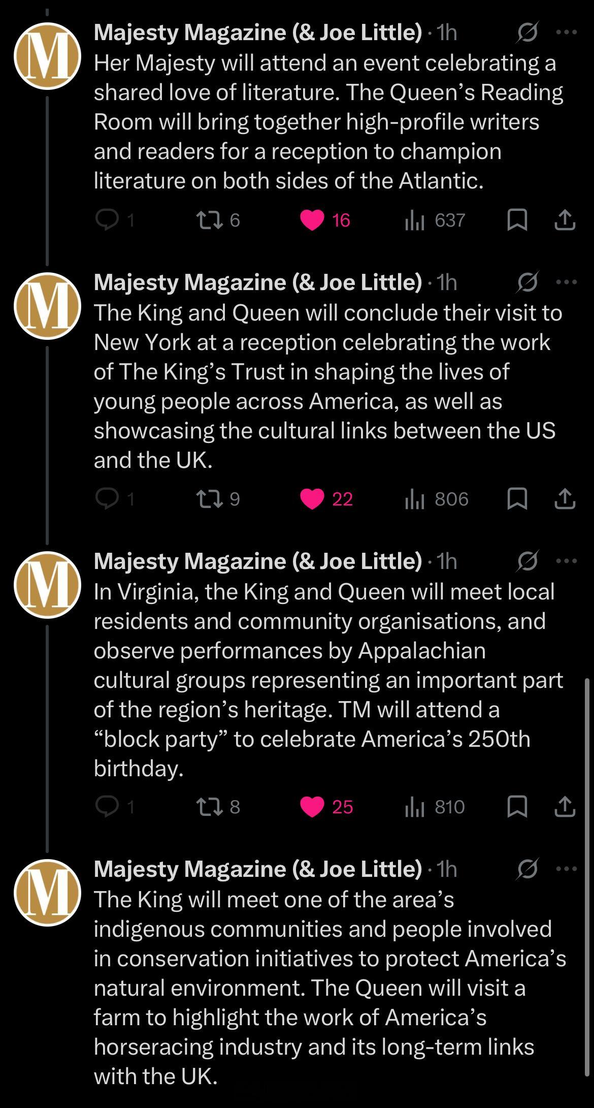 📍华盛顿:和Trump喝下午茶;和Trump参加花园派对;白宫举行欢迎仪式;查尔斯和Trump举行双边会谈,卡米拉则和第一夫人;查尔斯发表国会讲话;白宫晚宴;向阵亡者献花圈。